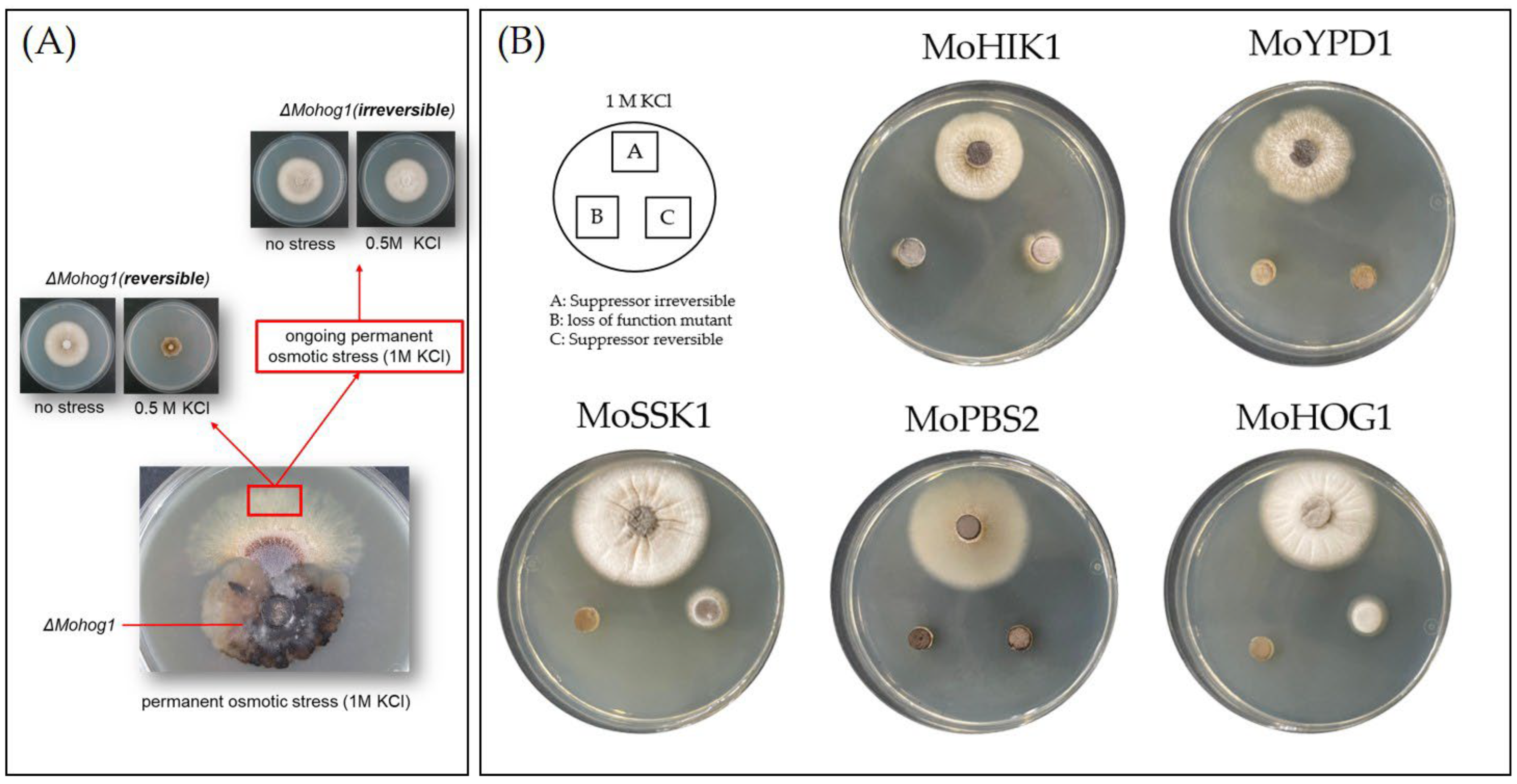 Magnaporthe oryzae lof mutants with an inactivated HOG pathway are sensitive to osmotic stress. In our previous study, it was found that under permanent osmotic stress, individual suppressor strains with reestablished osmoregulation arise out of these lof mutants [18]. In ongoing investigations of these suppressor strains (formerly identified and referred to as “adapted” strains, [18]), which have originated from ∆Mohik1, ∆Moypd1, ∆Mossk1, ∆Mossk2, ∆Mopbs2, and ∆Mohog1, we recently identified at least two types (or two “stages”) of suppressor strains. Therefore, we hypothesized that the mechanism of directed experimental adaptive (DEA) evolution is even more dynamic than originally expected (Figure 1A).