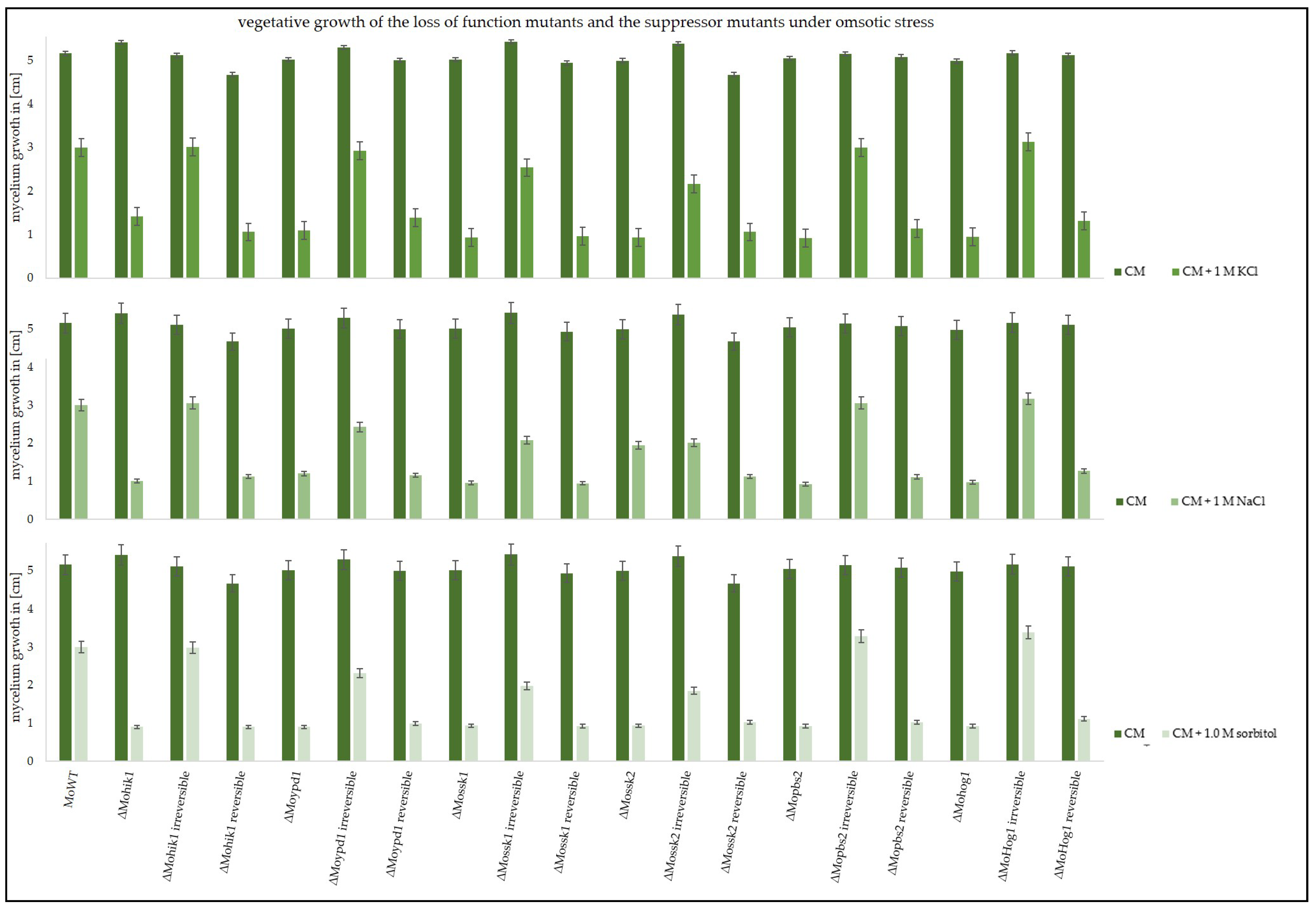 All irreversible suppressor strains, ∆Mohik1(irreversible), ∆Moypd1(irreversible), ∆Mossk1(irreversible), ∆Mossk2(irreversible), ∆Mopbs2(irreversible), and ∆Mohog1(irreversible), were found to be almost as vital as the wildtype strain in the different stressed situations. In contrast, the growth of reversible suppressor strains ∆Mohik1(reversible), ∆Moypd1(reversible), ∆Mossk1(reversible), ∆Mossk2(reversible), ∆Mopbs2(reversible), and ∆Mohog1(reversible) was strongly impaired as compared to the irreversible strains and the wildtype strain. But nevertheless, it has to be mentioned that the reversible strains are not as sensitive as the lof strains (Figure 2).