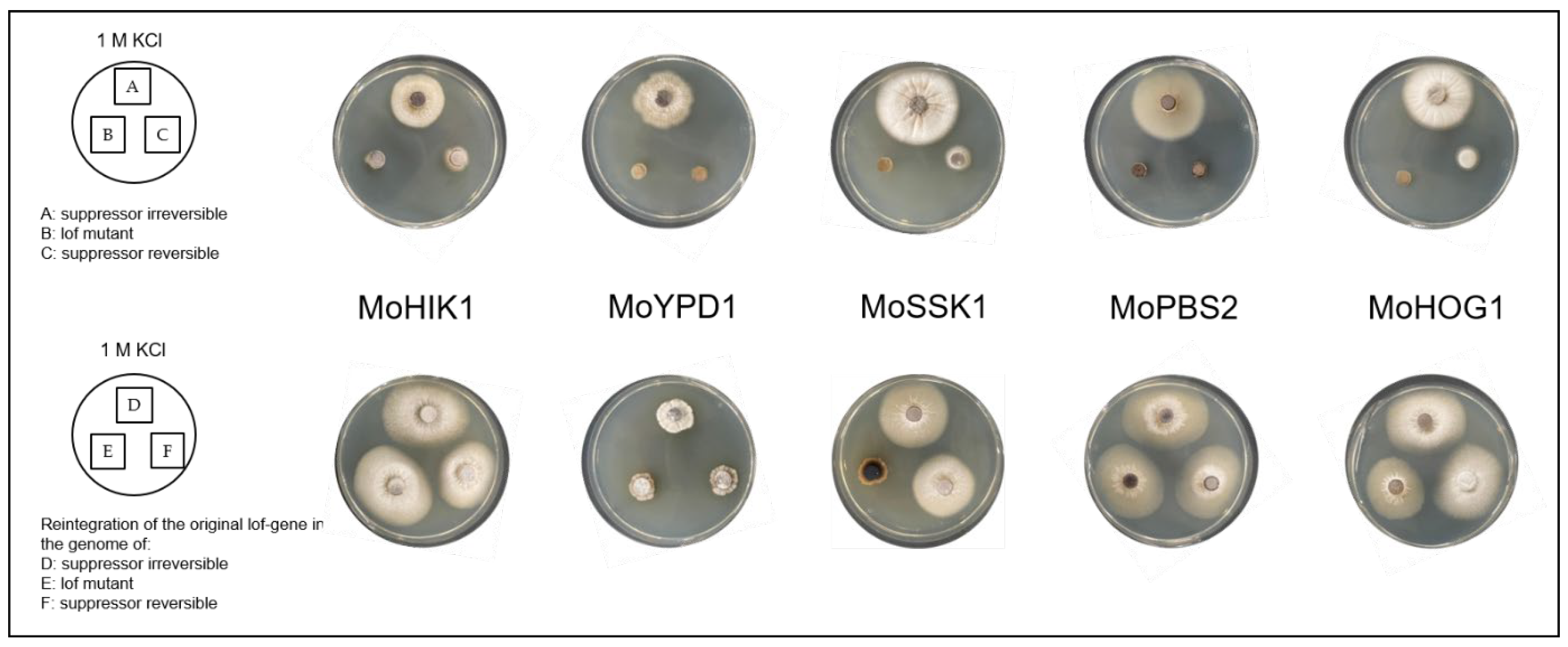 Figure 5. Vegetative growth of the Magnaporthe oryzae lof mutants, the suppressor mutants (irreversible and reversible), and the strains with the reintegration of the original lof-gene of the HOG pathway into the genome. The cultures were grown on media with osmotic stress (1 M KCl) for 7 days at 26 °C.