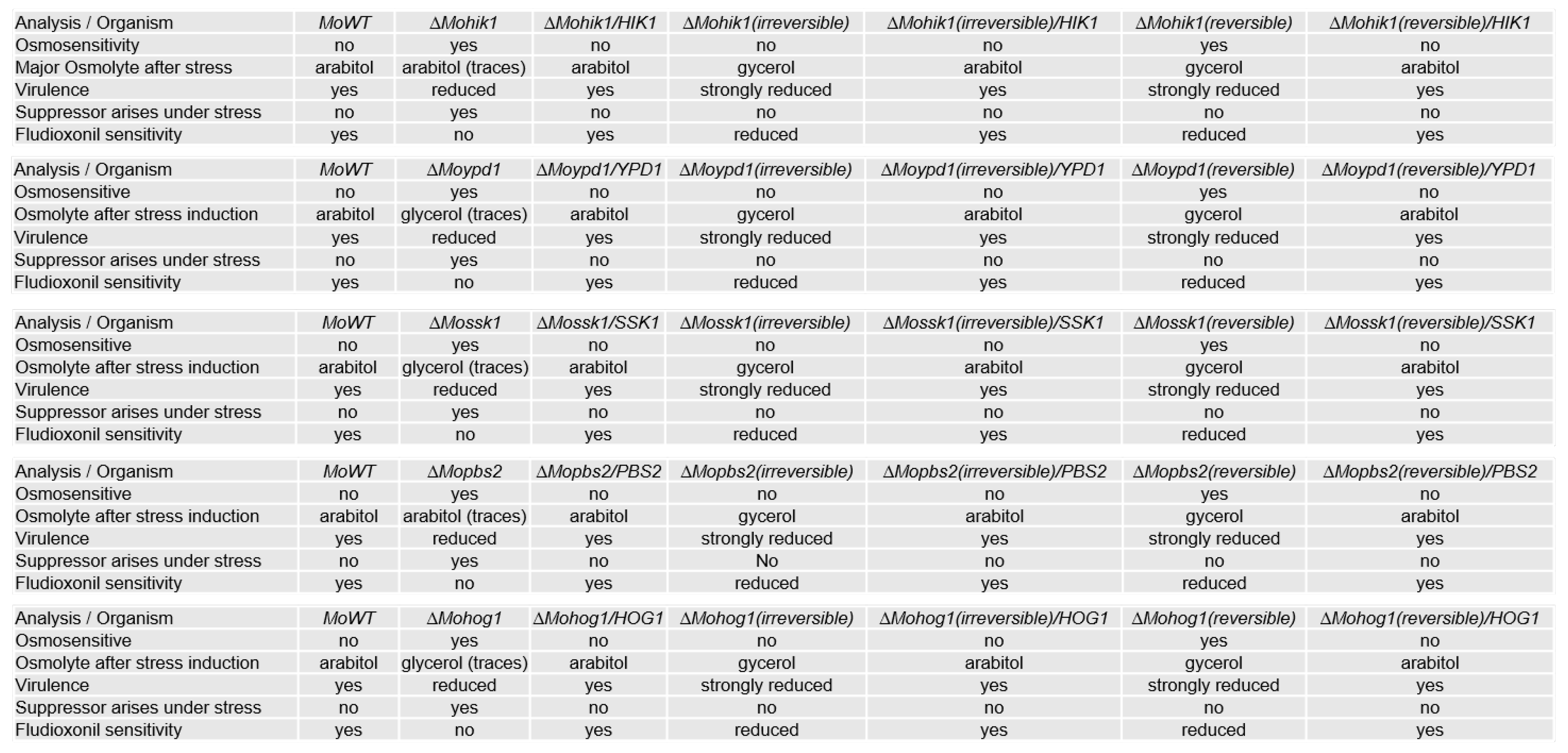 Figure 6. Overview of the most important phenotypes of the Magnaporthe oryzae lof mutants, the suppressor strains (reversible and irreversible) as well as the strains in which the HOG pathway is genetically reactivated.