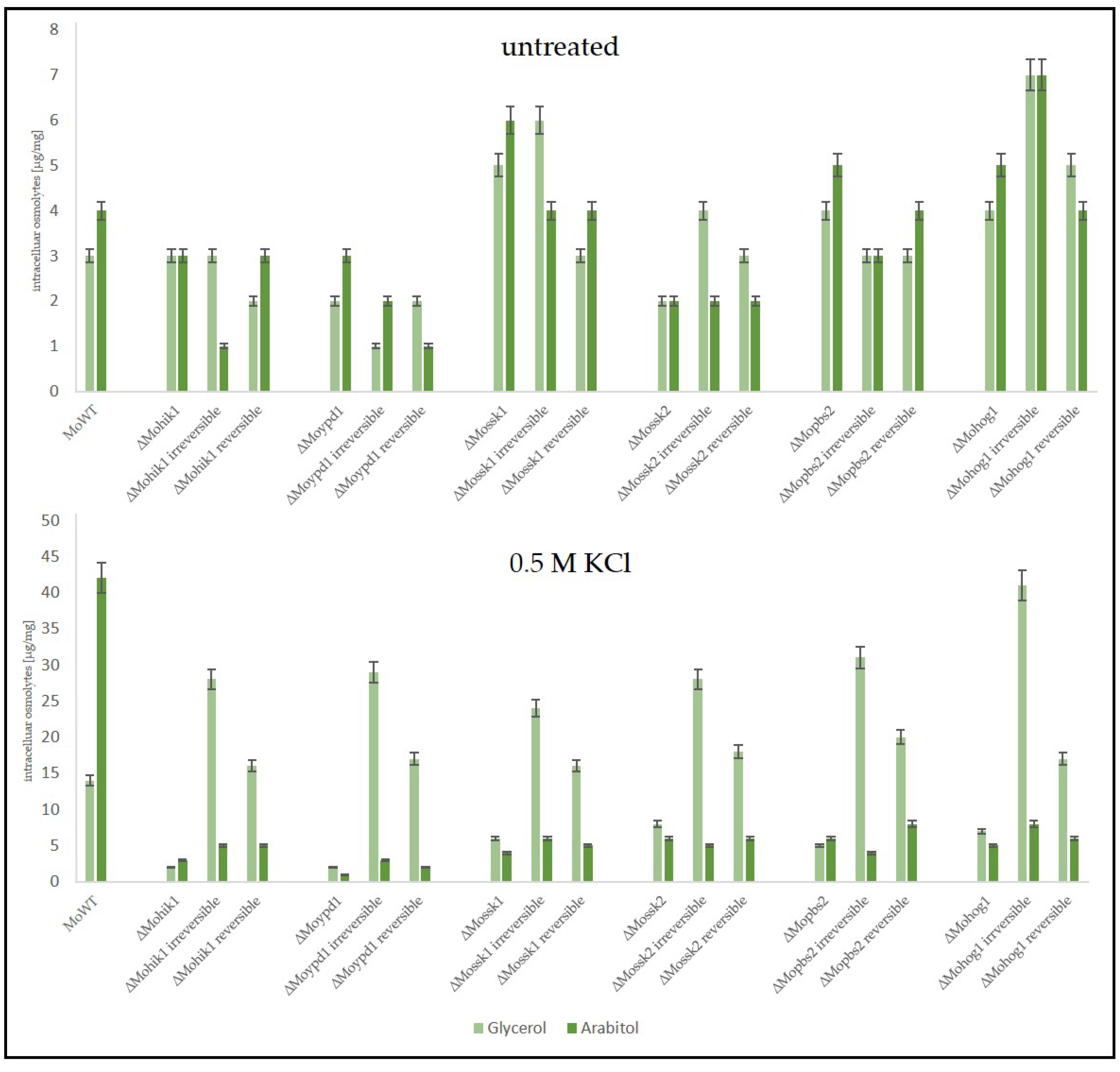 Figure 4. The production of compatible solutes as a stress response in the Magnaporthe oryzae wildtype strain (MoWT), and mutant strains with reintegrated lof-gene of the HOG pathway. The fungal strains were grown for 72 h in CM before being shocked with 0.5 M KCl. Carbohydrates were extracted after 7 h and quantified by HPAEC-PAD. Error bars represent the standard deviation of three biological replicates of each strain. Intracellular osmolyte concentration is given in µg/mg mycelial dry weight.