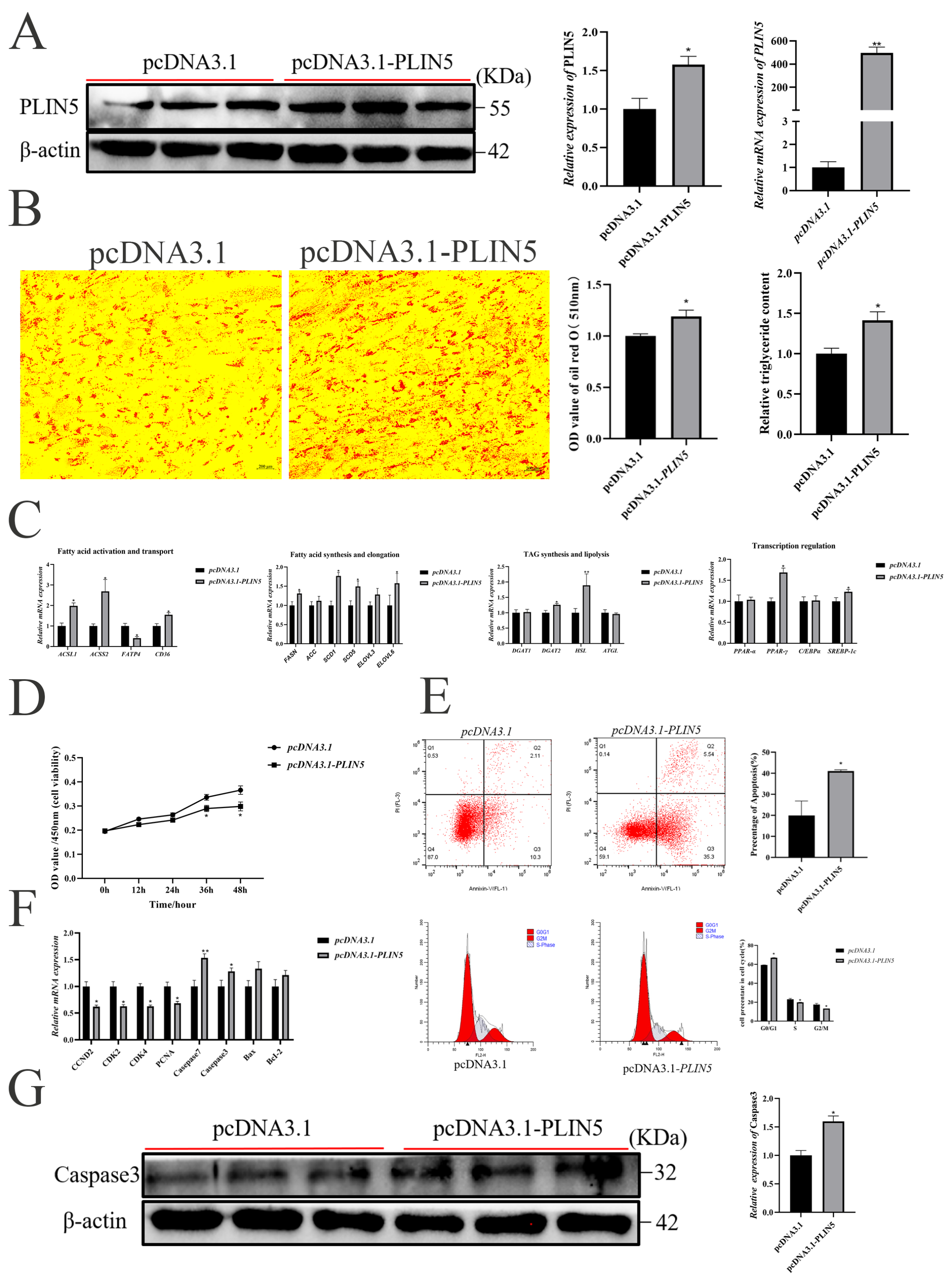 3.2. Overexpression of PLIN5 Promotes Adipogenesis and Inhibits Proliferation of Goat Intramuscular Preadipocytes