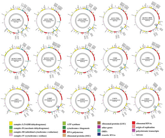 - Aguileta, G.; De Vienne, D.M.; Ross, O.N.; Hood, M.E.; Giraud, T.; Petit, E.; Gabaldón, T. High Variability of Mitochondrial Gene Order among Fungi. Genome Biol. Evol. 2014, 6, 451–465. [Google Scholar] [CrossRef]