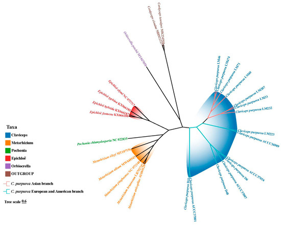 - Jia, J.; Li, C.; Tang, M.; Liao, H.; Yang, Z.; Wang, Y.; Li, M.; Zeng, W.; Wang, Y. Mitochondrial genome characterization, evolution and intron dynamics of the entomopathogenic genus Cordyceps. Front. Microbiol. 2025, 16, 1605218. [Google Scholar] [CrossRef] [PubMed]