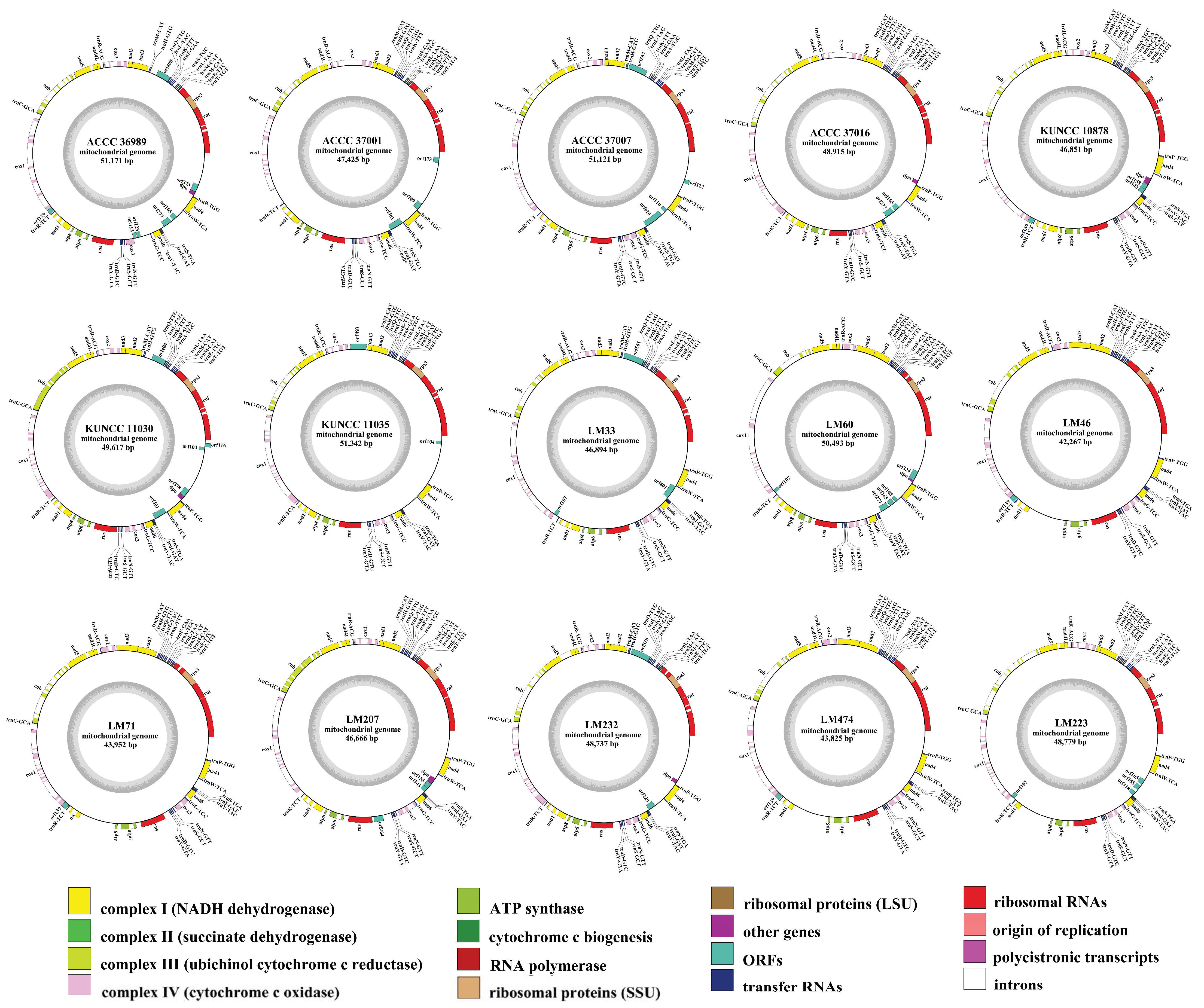 - Wolters, J.F.; LaBella, A.L.; Opulente, D.A.; Rokas, A.; Hittinger, C.T. Mitochondrial Genome Diversity across the Subphylum Saccharomycotina. bioRxiv 2023, 14, 1268944. [Google Scholar] [CrossRef]