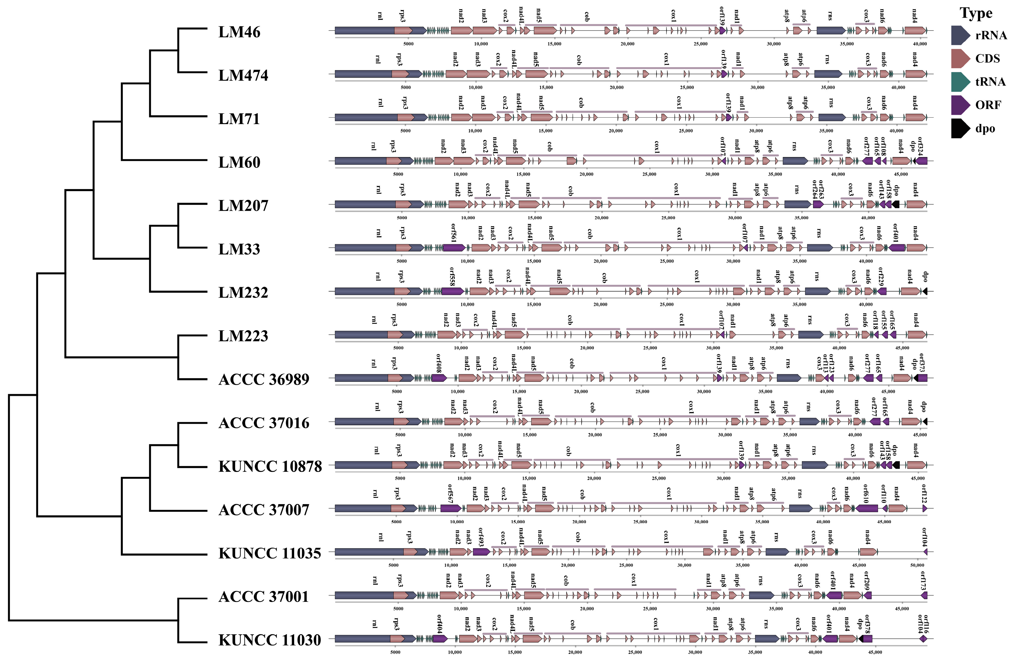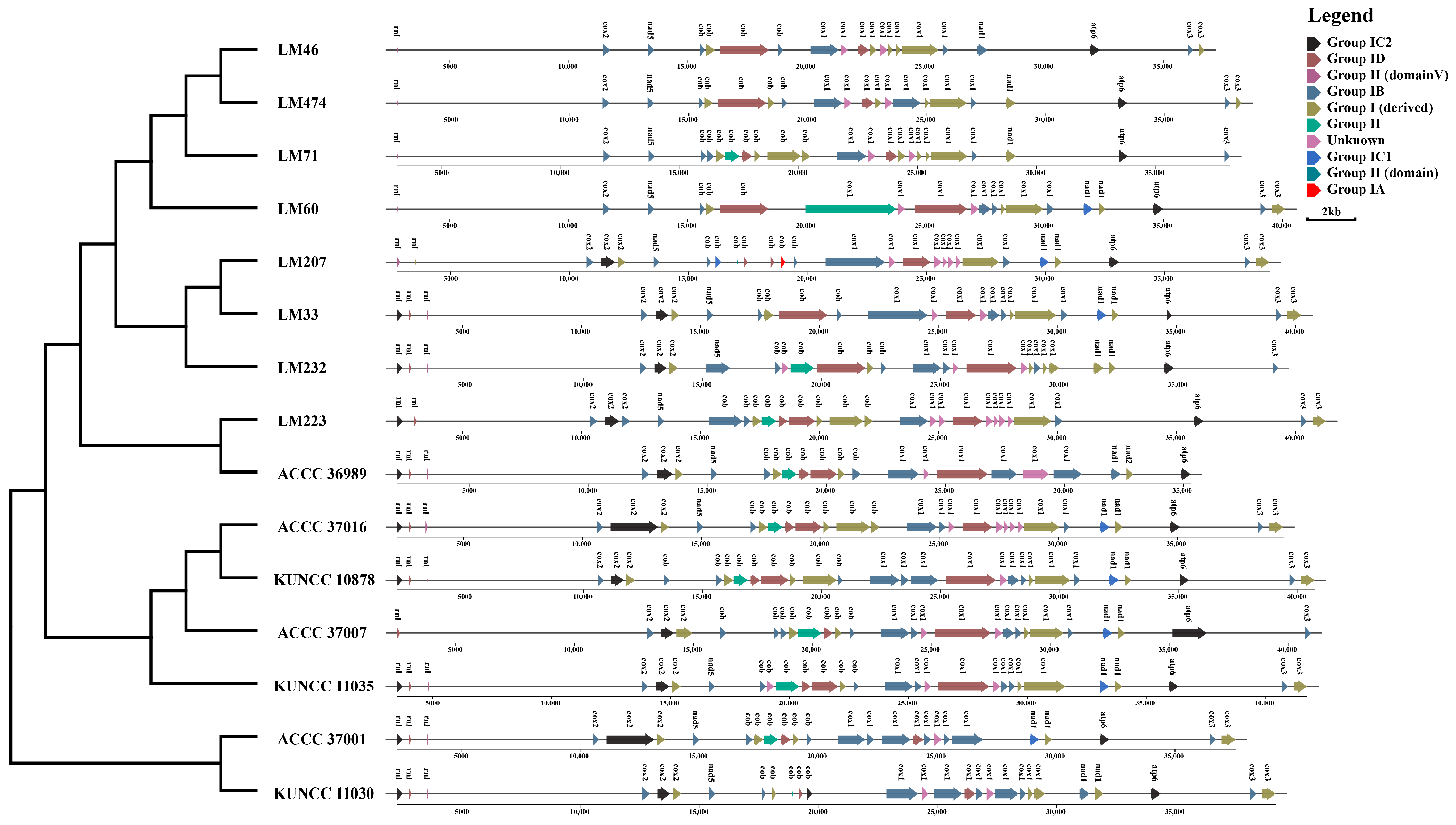 - Ma, Q.; Wu, H.; Geng, Y.; Li, Q.; Zang, R.; Guo, Y.; Xu, C.; Zhang, M. Mitogenome-Wide Comparison and Phylogeny Reveal Group I Intron Dynamics and Intraspecific Diversification within the Phytopathogen Corynespora Cassiicola. Comput. Struct. Biotechnol. J. 2021, 19, 5987–5999. [Google Scholar] [CrossRef]