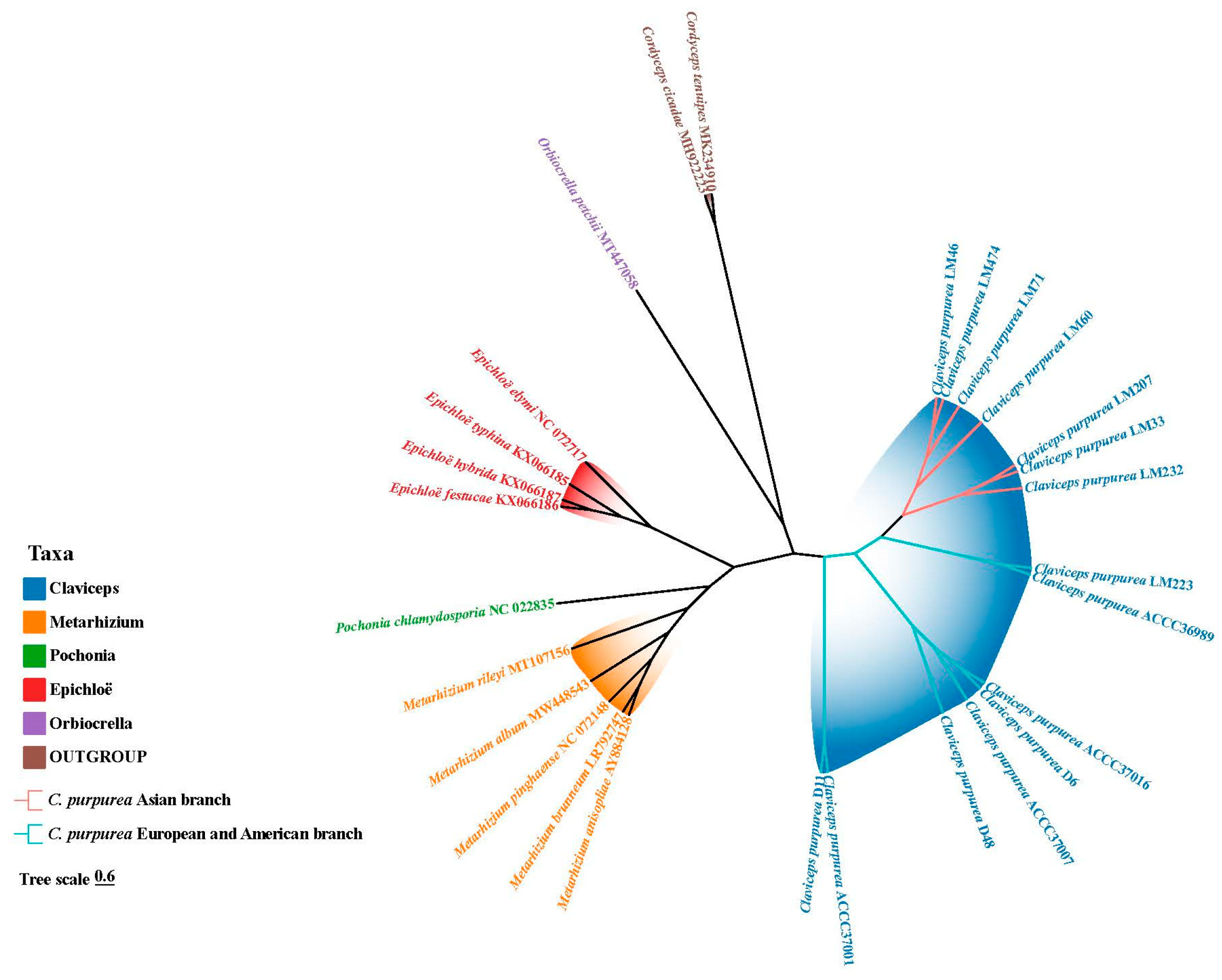 3.9. Phylogenetic Analysis of the Clavicipitaceae