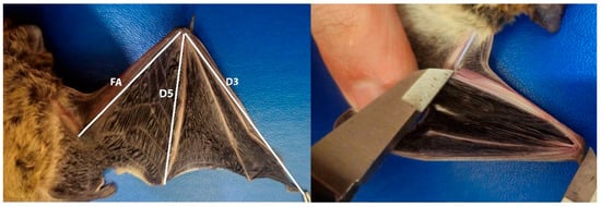 External morphometric measurements were taken from both carcass and live specimens of Pipistrellus species, including forearm length (FA), third digit length (D3), and fifth digit length (D5).