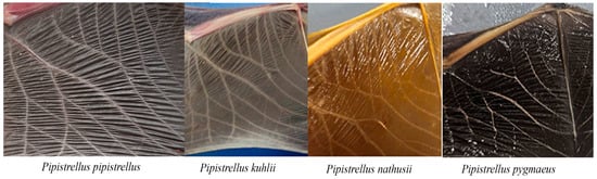 Illustrative diagrams of wing membrane patterns in different Pipistrellus species, based on diagnostic morphological traits described by Dietz and von Helversen [].