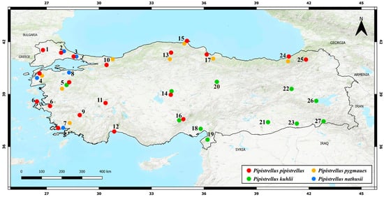Within Chiroptera, the genus Pipistrellus (family Vespertilionidae) represents a taxonomically and ecologically diverse group, distributed across the Palearctic region and known for its cryptic morphology, high dispersal capabilities, and wide habitat tolerance [,]. The genus includes approximately 35 species globally. Four species—P. pipistrellus (Schreber, 1774), P. kuhlii (Kuhl, 1817), P. nathusii (Keyserling & Blasius, 1839), and P. pygmaeus (Leach, 1825)—are confirmed to occur in Türkiye []. These species are often sympatric, yet their identification remains problematic due to subtle morphological differences and the presence of cryptic species complexes [,,,].