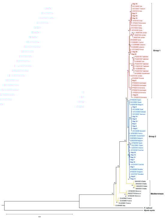 Maximum Likelihood (ML) analyses of P. pipistrellus, which utilized the HKY+G substitution model (best-fit according to the Bayesian Information Criterion, BIC), resolved three major intraspecific lineages (Figure 4). Group 1 encompassed specimens from eastern and central Türkiye, clustering with sequences from Cyprus, the Middle East, the Caucasus, and Central Asia. Group 2 included individuals from western and northwestern Türkiye (a wide range of 20 provinces) and sequences from Europe and the Balkans. The Mediterranean group included multiple distinct lineages comprising specimens from Morocco, Sicily, France, and Malta. Bootstrap support for the split between Group 1 and Group 2 was 68%, while the Mediterranean group showed robust phylogenetic separation (93%). Pairwise genetic distances (Kimura-2-parameter, K2P) further supported this structure: mean divergences were 2.2% ± 0.40 (Group 1 vs. Group 2), 4.5% ± 0.71 (Group 1 vs. Mediterranean), and 4.7% ± 0.72 (Group 2 vs. Mediterranean) (Table S2). Gene flow estimates [] indicated very limited migration between these lineages: Nm = 0.16 (Group 1 vs. Group 2), Nm = 0.08 (Group 1 vs. Mediterranean), and Nm = 0.12 (Group 2 vs. Mediterranean). All Nm values fell below the isolation threshold (Nm < 1), confirming ongoing genetic isolation.