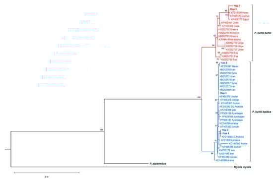 Maximum Likelihood (ML) phylogenetic tree of Pipistrellus kuhlii based on Cytb sequences. Bootstrap support values (>50%) are shown at the nodes.