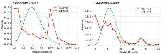 Mismatch distribution analyses and neutrality tests were performed to assess the demographic history of P. pipistrellus (Table S2). Group 1 (n = 81) comprised 32 haplotypes (S = 41), showing moderate haplotype diversity (h = 0.846) and low nucleotide diversity (π = 0.005). Neutrality tests yielded a negative Tajima’s D (−1.170, not significant) but a significantly negative Fu’s Fs (−16.766, p < 0.02). The mismatch distribution exhibited a multimodal pattern (Figure 7), showing deviation from the expectations of a simple sudden expansion model. Group 2 (n = 48) contained very high haplotype diversity (h = 0.982) and nucleotide diversity (π = 0.006), similar to Group 1, with 64 segregating sites observed. Both Tajima’s D (−0.834) and Fu’s Fs (4.646) were non-significant. The mismatch distribution was highly irregular and multimodal (Figure 7).