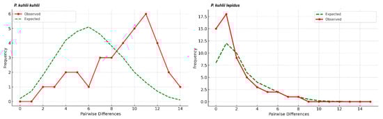Mismatch distribution analyses revealed contrasting demographic signals between the lineages. P. k. lepidus showed significantly negative Tajima’s D and Fu’s Fs values, and a mismatch curve that broadly aligned with the sudden expansion model. This result provides strong statistical evidence for a past population expansion in the eastern lineage. Conversely, P. k. kuhlii showed positive and non-significant neutrality indices and a multimodal curve, suggesting long-term stability or mild contraction. The complex, multimodal pattern observed when all individuals were pooled (Figure 9) is likely a direct reflection of the co-existence of these two deeply divergent lineages, masking the simpler expansion signal found within P. k. lepidus.