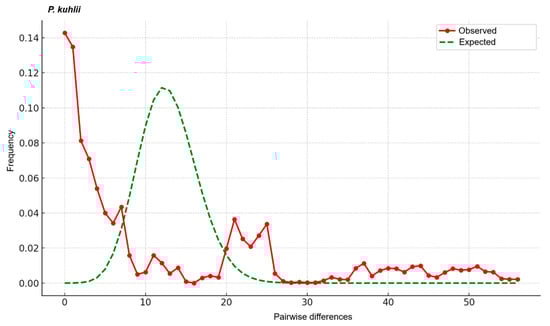 In P. k. kuhlii (n = 29), six haplotypes were detected (h = 0.835; π = 0.0305). Both Tajima’s D (1.254) and Fu’s Fs (2.888) were positive but non-significant. The mismatch curve was multimodal and skewed (Figure 8). Conversely, in P. k. lepidus (n = 57), seven haplotypes were detected (h = 0.396; π = 0.006). Both Tajima’s D (−1.850, p < 0.05) and Fu’s Fs (−2.042, p < 0.05) were significantly negative. The mismatch curve broadly aligned with the sudden expansion model, though it exhibited slight undulations and asymmetry (Figure 8). When all P. kuhlii individuals were pooled (n = 86), the overall mismatch pattern (Figure 9) showed a divergence from the simple sudden expansion model. This pattern was characterized by high frequencies at low pairwise differences, followed by a multimodal distribution.