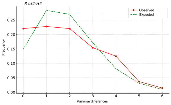 Analyses of P. nathusii (n = 11) identified nine haplotypes, yielding high haplotype diversity (h = 0.73) and low nucleotide diversity (π = 0.002), with 11 segregating sites found. Tajima’s D was significantly negative (−2.152, p < 0.05), whereas Fu’s Fs was positive (13.596). The mismatch distribution (Figure 10) was slightly asymmetric and right-skewed, exhibiting a mild deviation from a Poisson-like sudden expansion curve.