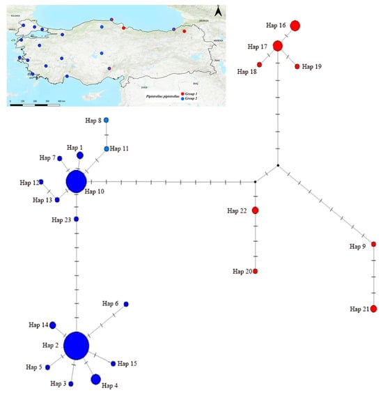 A median-joining network (MJN) was constructed using the Cytb haplotypes to visualize intraspecific genetic structuring in P. pipistrellus (Table S1, Figure 11). The network topology was compared with the ML phylogeny. The network revealed both widespread and highly localized haplotypes. Haplotype 2 (Hap 2) was widely distributed across numerous localities (including Çanakkale, Muğla, İzmir, Niğde, Rize, and Sinop) and occupied a central position. In contrast, Haplotype 9 (Hap 9) was recorded from a similarly broad range (Edirne, Antalya, Kastamonu, Sakarya, and Sinop) but remained peripheral. Notably, individuals from provinces such as Sinop (Hap 2, 10, 20, 21), Rize (Hap 2, 15–18), and Niğde (Hap 2, 22) were present in both major phylogenetic groups (Group 1 and Group 2).