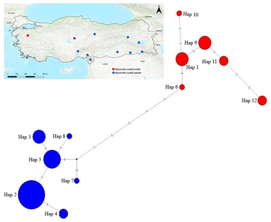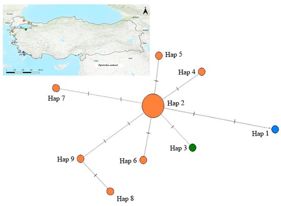 For P. nathusii, the MJN analysis used Turkish specimens and European GenBank sequences, revealing nine haplotypes and their geographic relationships (Figure 13). Haplotype 2 (Hap 2) formed the network core, encompassing individuals from Çanakkale, Tekirdağ, Bursa, and İstanbul, along with samples from Spain, Switzerland, and Belgium. Conversely, the Muğla haplotype (Hap 1) was distinctly positioned on the periphery with minimal connections. The Bursa haplotype (Hap 3) was also rare and distinct. Other haplotypes (Hap 4–9) branched directly around Hap 2, linking Turkish and European sequences. This network structure showed extensive genetic continuity across the species’ range.