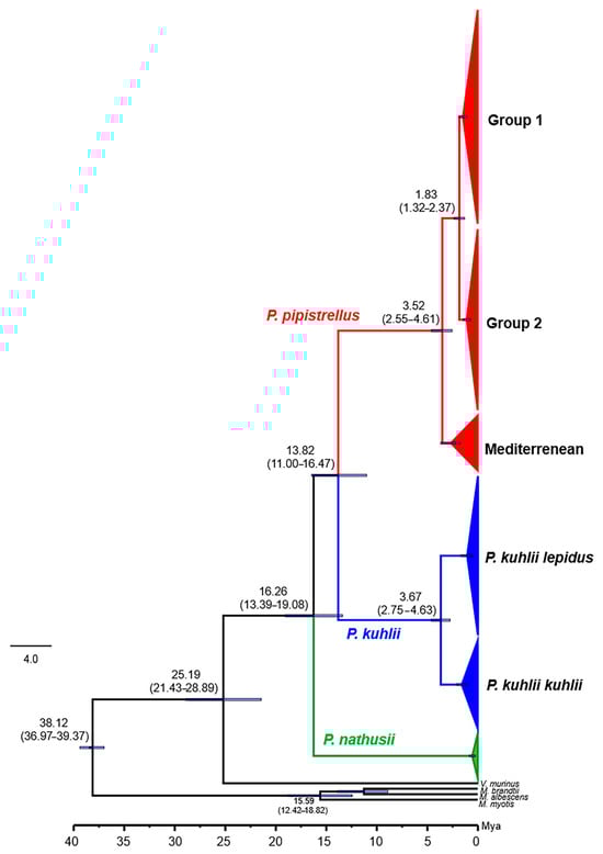 Time-calibrated phylogeny of Pipistrellus species based on cytochrome b sequences. Median divergence times (Mya) are shown at major nodes, with 95% highest posterior density (HPD) intervals in parentheses. Node bars represent 95% HPD intervals. Lineages are color-coded: P. pipistrellus (red), P. kuhlii (blue), and P. nathusii (green). Outgroups included Myotis brandtii, M. albescens, M. myotis, and Vespertilio murinus. Fossil-calibrated priors were set following Borges et al. [].