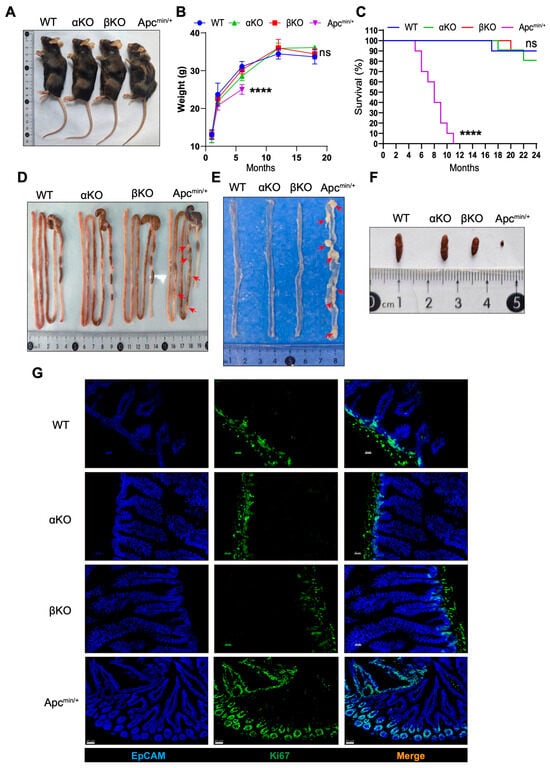 GSK3 forms a regulatory complex with APC to modulate Wnt/β-catenin signaling, which is essential for intestinal homeostasis. To investigate the specific roles of GSK3α and GSK3β in intestinal epithelium, we generated intestinal-specific knockout mice (Gsk3αfl/fl; Villin-cre, termed αKO, and Gsk3βfl/fl; Villin-cre, termed βKO) and compared their phenotypes with the WT and ApcMin/+ controls. Both αKO and βKO mice displayed normal growth, body weight, fecal pellet formation, and survival. In contrast, ApcMin/+ mice developed progressive weight loss (nearly a 20% reduction), intestinal abnormalities (hyperplastic polyps), and 100% mortality within 4–12 months (Figure 1A,C). The histopathological examination revealed characteristic hyperplastic polyps in ApcMin/+ intestines, whereas αKO and βKO mice maintained normal intestinal architecture (Figure 1D–F). Epcam staining demonstrated villus elongation in αKO, βKO, and ApcMin/+ mice compared to the WT controls (Figure 1G), associated with enhanced β-catenin expression. Ki67 staining showed extensive proliferative clusters extending along the crypt–villus axis in ApcMin/+ intestines, while αKO and βKO mice exhibited normal proliferation restricted to crypt regions. Additional analyses confirmed the absence of polyp formation in both αKO and βKO mice based on a near two-year observation period. These results demonstrate that individual deficiency of GSK3α or GSK3β does not disrupt intestinal homeostasis or promote tumorigenesis.