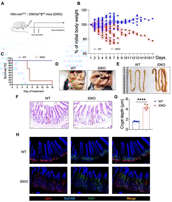 Perinatal mortality in DKO mice limited subsequent intestinal development, which prevented further analysis of feeding and intestinal function. To address this, we crossed Villin-ERT2cre mice with Gsk3-floxed mice to generate inducible double-knockout (iDKO) mice. Tamoxifen was administered orally to adult mice to induce Gsk3 deletion (Figure 3A). The results showed that iDKO mice showed rapid weight loss (nearly a 20% reduction) and died within 7–10 days following Gsk3 deletion (Figure 3B,C), indicating that GSK3 deficiency still induces lethality in adult mice, even after normal intestinal development, and highlighting the essential role of Gsk3 in the intestine. Furthermore, the intestinal morphology of Gsk3 deficient mice exhibited a megacolon-like phenotype (Figure 3D,E), consistent with previous observations in DKO mice. Although villus length did not increase significantly in adult iDKO mice, the crypt area was still enlarged, and villi displayed branching and crypt-like structures, suggesting disrupted localization and function of intestinal stem cells following Gsk3 deletion (Figure 3F). The analysis of Lyz1+ Paneth cells and Ki67+ transient amplifying cells showed a significant increase in both cell types in iDKO intestines. Lyz1+ Paneth cells were no longer confined to the crypt base but had migrated toward the villus tips, while transient amplifying cells were distributed along the villi (Figure 3G). Intestinal abnormalities can directly or indirectly cause functional impairments, leading to digestive disorders, compromised barrier function, dehydration, infection, or severe diarrhea. Collectively, these results demonstrate that GSK3 is essential for maintaining normal intestinal function in adult mice.