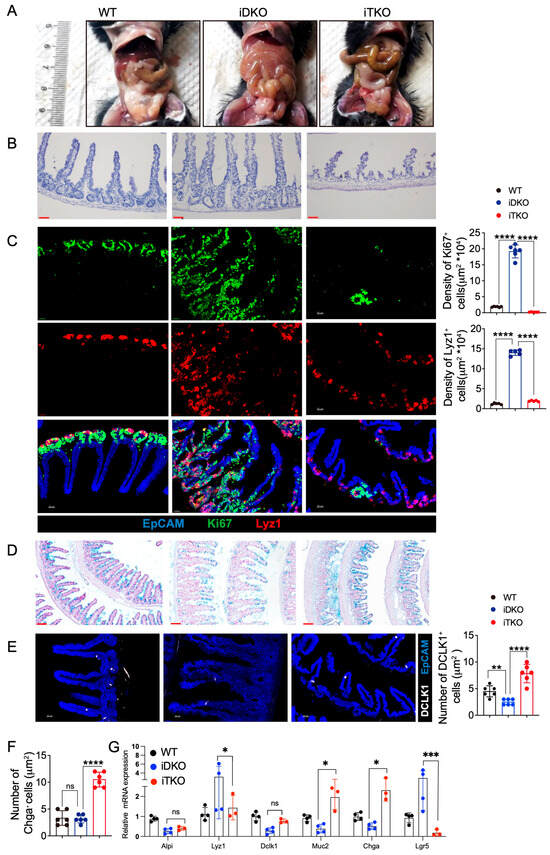 Further analysis showed markedly reduced numbers of Paneth cells and transient amplifying cells in iTKO intestines. Additionally, Lyz1⁺ Paneth cells were largely confined to the crypt base, with only a few migrating toward the villus tips (Figure 8C). These findings indicate that β-catenin deletion significantly suppressed cell proliferation and partially restored Paneth cell localization. We next analyzed the number and distribution of tuft cells, enteroendocrine cells, and goblet cells. As shown in Figure 8D, compared to iDKO mice, iTKO mice had significantly more goblet cells, which were redistributed uniformly along the villi. iTKO mice also exhibited increased numbers of enteroendocrine cells and tuft cells (Figure 8E,F). RT-qPCR analysis of intestinal epithelial cell markers confirmed that iTKO mice had fewer Paneth cells and Lgr5⁺ stem cells compared to iDKO mice, while goblet cells and enteroendocrine cells were increased (Figure 8G). These data demonstrate that deletion of β-catenin expression partially restores the number and distribution of functional intestinal cells as well as goblet cell secretion, which improves the intestinal niche. However, due to the significant reduction in intestinal stem cells, the mice ultimately still died.