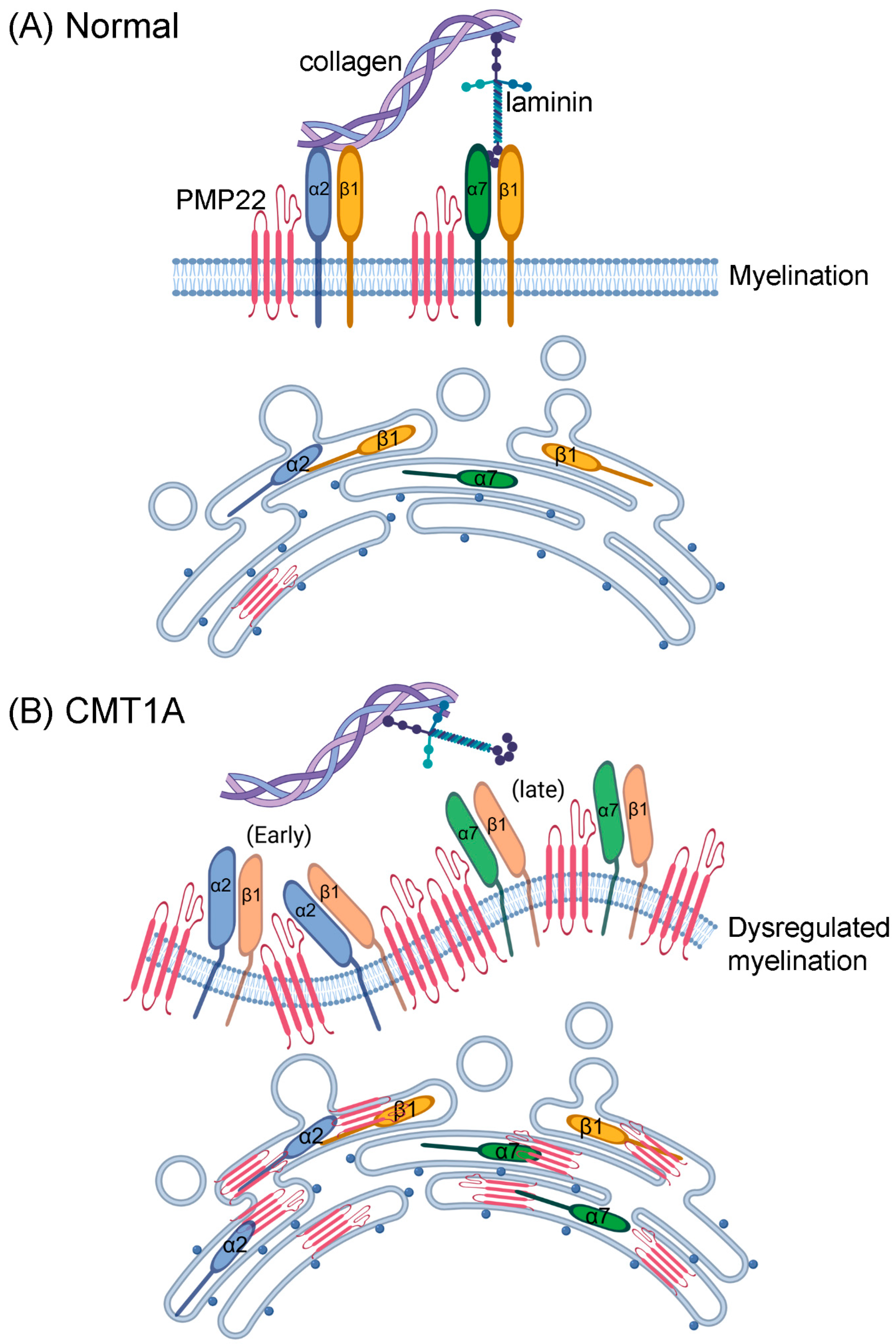 - Berti, C.; Nodari, A.; Wrabetz, L.; Feltri, M.L. Role of integrins in peripheral nerves and hereditary neuropathies. Neuromol. Med. 2006, 8, 191–204. [Google Scholar] [CrossRef]