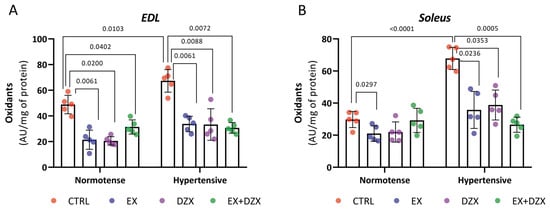 The levels of oxidants in the muscle EDL that were subjected to a fatigue protocol are shown in Figure 1A. It is demonstrated that there are higher levels of oxidants in the hypertensive group (p = 0.0103) compared to the control group. However, these values are decreased in the hypertensive groups that underwent a moderate-intensity exercise protocol (p = 0.0061), diazoxide administration (p = 0.0088), and the combination of both (p = 0.0072). A similar pattern can be observed in the soleus muscle post-fatigue in Figure 1B. Oxidant levels were elevated in the hypertensive group compared to the control group (p < 0.0001). However, these levels were reduced in the hypertensive + diazoxide group (p = 0.0353), hypertensive + exercise group (p = 0.0236), and hypertensive + exercise + diazoxide group (p = 0.0005). These results demonstrate that oxidants increased in the hypertensive groups after a fatigue induction protocol in both fast-twitch and slow-twitch muscles, and the treatments of exercise and diazoxide reversed this.
