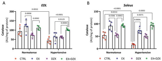 The results of the catalase activity of the EDL muscle post-fatigue are shown in Figure 2A. As can be observed, the hypertensive group (p = 0.0032) has decreased activity compared to the control group, indicating a reduction in the antioxidant system of catalase. On the contrary, in the hypertensive groups treated with exercise and diazoxide (p < 0.0001), an increase in catalase activity was observed, demonstrating that the treatments are beneficial in restoring the enzyme’s activity. In Figure 2B, the results for the soleus muscle post-fatigue are shown. Catalase activity was significantly decreased in the hypertensive group (p < 0.0001) versus the control group. For the hypertensive + exercise (p = 0.0006), hypertensive + diazoxide (p = 0.0075), and hypertensive + exercise + diazoxide (p = 0.0005) groups, catalase activity increased significantly.
