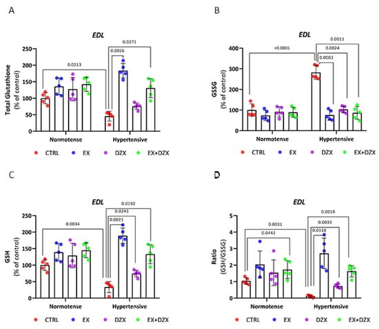 In Figure 3A, the results of total glutathione for the post-fatigue EDL muscle are shown, where a decrease is observed in the hypertensive group compared to the control group (p = 0.0213). However, this is improved in the hypertensive + exercise (p = 0.0026) and hypertensive + exercised + diazoxide (p = 0.0271) groups. In oxidized glutathione (Figure 3B), the hypertensive group exhibits higher levels compared to the control group (p < 0.0001). With the administration of diazoxide (p = 0.0024), the implementation of exercise (p = 0.0033), and the combination of both (p = 0.0011), the level of significance is significantly decreased. In contrast, reduced glutathione (Figure 3C) decreased in the hypertensive group (p = 0.0034); however, with exercise (p = 0.0023), with diazoxide (p = 0.0243), and the combination of diazoxide + exercise (p = 0.0192), GSH values increased significantly. In the GSH/GSSG ratio (Figure 3D), the hypertensive group (p = 0.0034) showed decreased values considerably; however, moderate-intensity exercise (p = 0.0118), diazoxide (p = 0.0033), and the combination of exercise + diazoxide (p = 0.0018) increased the activity of the glutathione antioxidant system, indicating that the treatments had beneficial effects on the EDL muscle post-fatigue during hypertension.