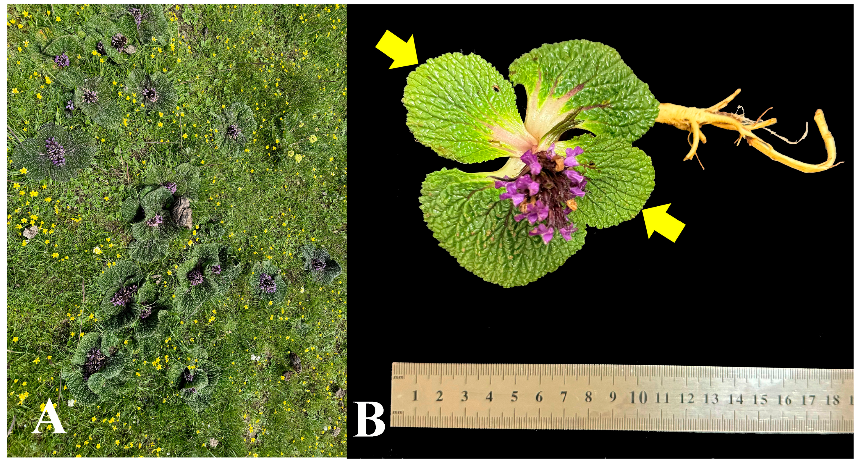 - Li, Y.; Li, F.; Zheng, T.T.; Shi, L.; Zhang, Z.G.; Niu, T.M.; Wang, Q.Y.; Zhao, D.S.; Zhao, P. Lamiophlomis herba: A comprehensive overview of its chemical constituents, pharmacology, clinical applications, and quality control. Biomed. Pharmacother. 2021, 144, 112299. [Google Scholar] [CrossRef] [PubMed]