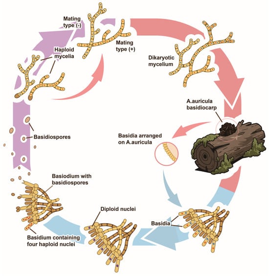 Fresh Auricularia auricula fruiting bodies exhibit a gelatinous to cartilaginous texture, displaying pronounced hygroscopic properties—swelling upon hydration and rigidifying upon dehydration. Morphological variations range from cup-shaped to ear-like or irregular forms, with growth patterns that may be solitary or clustered. The dorsal (infertile) surface is convex and tomentose, whereas the ventral (fertile) surface is concave, smooth, or wrinkled, bearing basidiospores. Spores are reniform or cylindrical, hyaline, and typically contain one to several oil droplets [6]. Mycelium consists of tubular hyphae that branch and intertwine, forming a white, tree-like network that gradually turns brown with age [7]. Optimal mycelial growth occurs between 25 and 30 °C and pH 5.0–7.0, though significant interspecific variation exists in temperature, humidity, and pH tolerance. The carbon-to-nitrogen (C/N) ratio governs different developmental stages: mycelium stage (C/N ~20:1), primordia formation stage (C/N 30–40:1), and fruiting body emergence stage (C/N ~30:1). Reference [8] reported an optimal temperature range of 22–24 °C for efficient fruiting body emergence, characterized by rapid and orderly development. Transmission electron microscopy revealed that mycelial senescence involves mitochondrial swelling, nucleolar disappearance, and cell wall degradation, culminating in programmed cell death [9]. A. auricula is a bipolar heterothallic fungus, governed by a single mating type locus with two alleles. Mature fruiting bodies produce basidiospores of compatible mating types. Upongermination, these spores form uninucleate mycelia or conidia. Compatible uninucleate mycelia fuse to form dikaryotic mycelia, which proliferate via clamp connections and ultimately form basidia. Mature basidia produce numerous basidiospores, completing the life cycle (Figure 1) [10,11].