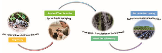 China’s cultivation of A. auricula dates back 1400 years. The evolution of artificial cultivation can be categorized into four stages: spore natural inoculation, spore liquid spraying, pure strain inoculation on wood logs, and cultivation on substitute substrates (Figure 2). Historical records, such as Su Jing’s Xin Xiu Ben Cao (Newly Revised Materia Medica) from the Tang Dynasty, describe A. auricula growth on mulberry, sophora, paper mulberry, elm, and willow trees, noting the edibility of tender varieties and medicinal uses (e.g., sophora-grown for hemorrhoids). A described cultivation method involved spreading congee on wood and covering it with straw to induce growth, suggesting that pioneers provided nutrients via irrigation for natural spore inoculation. Wang Zhen’s Nongshu from the Song/Yuan period recorded a method involving chopping fruiting bodies into grooves, covering with artemisia leaves and soil, and periodic irrigation with rice rinsing water, resulting in fruiting body emergence under warm, humid conditions post-rainfall. The utilization of fungal nutrients and spore mixtures for artificial inoculation represents a more recent development. The invention of the microscope enabled the discovery of microorganisms, paving the way for direct inoculation of pure fungal cultures onto wood logs (e.g., linden). Significant advancements and proliferation occurred with the maturation of substitute substrate cultivation technology [12]. Large-scale cultivation of A. auricula is primarily concentrated in South Korea, Japan, and Southeast Asia, while Western nations focus on pharmacological research. European nations and the United States primarily focus on pharmacological research, relying predominantly on imports for consumption. Currently, A. cornea and A. heimuer are the predominant species cultivated globally. Market germplasm resources originate mainly from wild domestication, with a limited proportion derived from artificial hybridization [13]. A. cornea is extensively cultivated in China using both wood log inoculation and substitute substrate methods. Substitute cultivation has gained popularity due to its cost-effectiveness and higher productivity compared to traditional wood log cultivation [14].