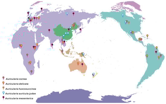 Global distribution of Auricularia species complexes.