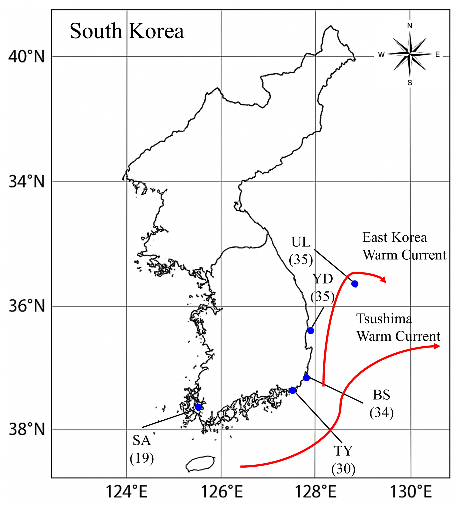Figure 1. Sampling locations of S. thompsoni in the Korean Peninsula. BS, Busan population; SA, Sinan population; TY, Tongyeong; UL, Ulleungdo, YD, Yeongduk. The number in parentheses following the regional abbreviation is the sample size. The red lines represent ocean currents, the Tsushima and East Sea warm currents respectively.