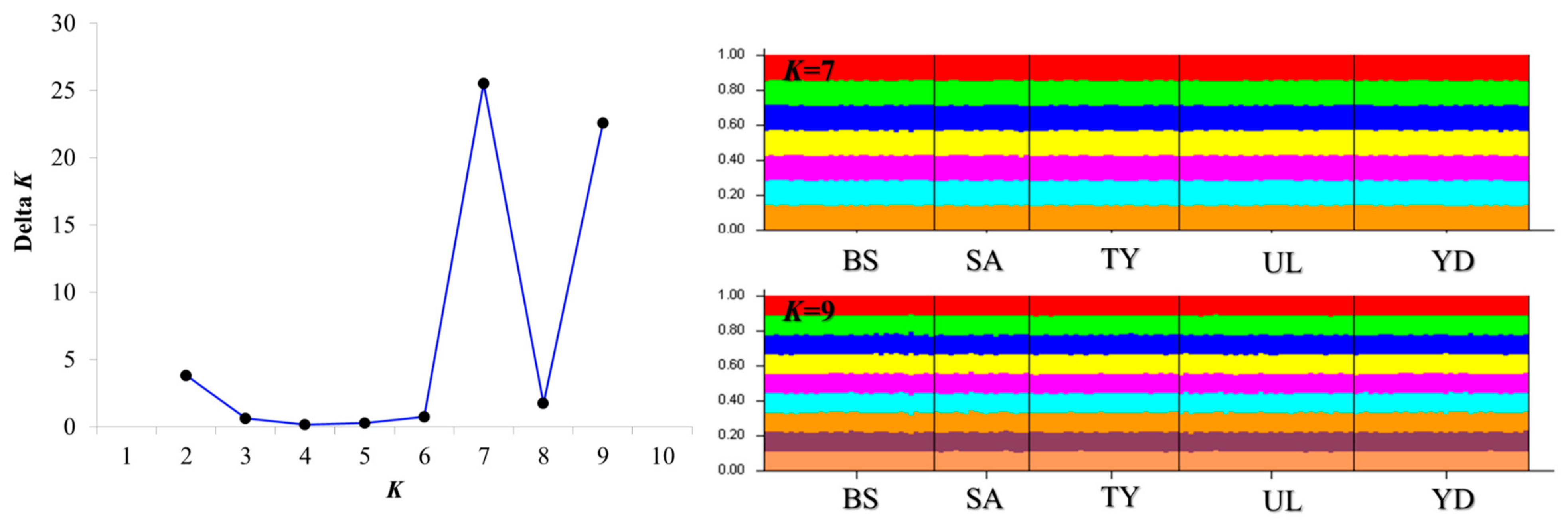 In the microsatellite dataset, most FST values were not statistically significant, and all FST values between populations were less than 0.01, indicating very low genetic differentiation (Table 3). STRUCTURE analysis maximized the delta K value for the population structure at K = 7 and 9 (Figure 2). According to the STRUCTURE results, K = 1, which has an L(K) value close to 0, is the most suitable model (Table 4). The results of DAPC, which analyzes the population structure based on a model-less method, showed that each population (BS, SA, TY, UL, YD) was mixed and formed into one population, unlike the results of STRUCTURE analysis (Figure 2 and Figure 3). The STRUCTURE software showed panmixia at both K = 7 and 9, indicating that all populations belong to a single, genetically homogeneous group (Figure 3).