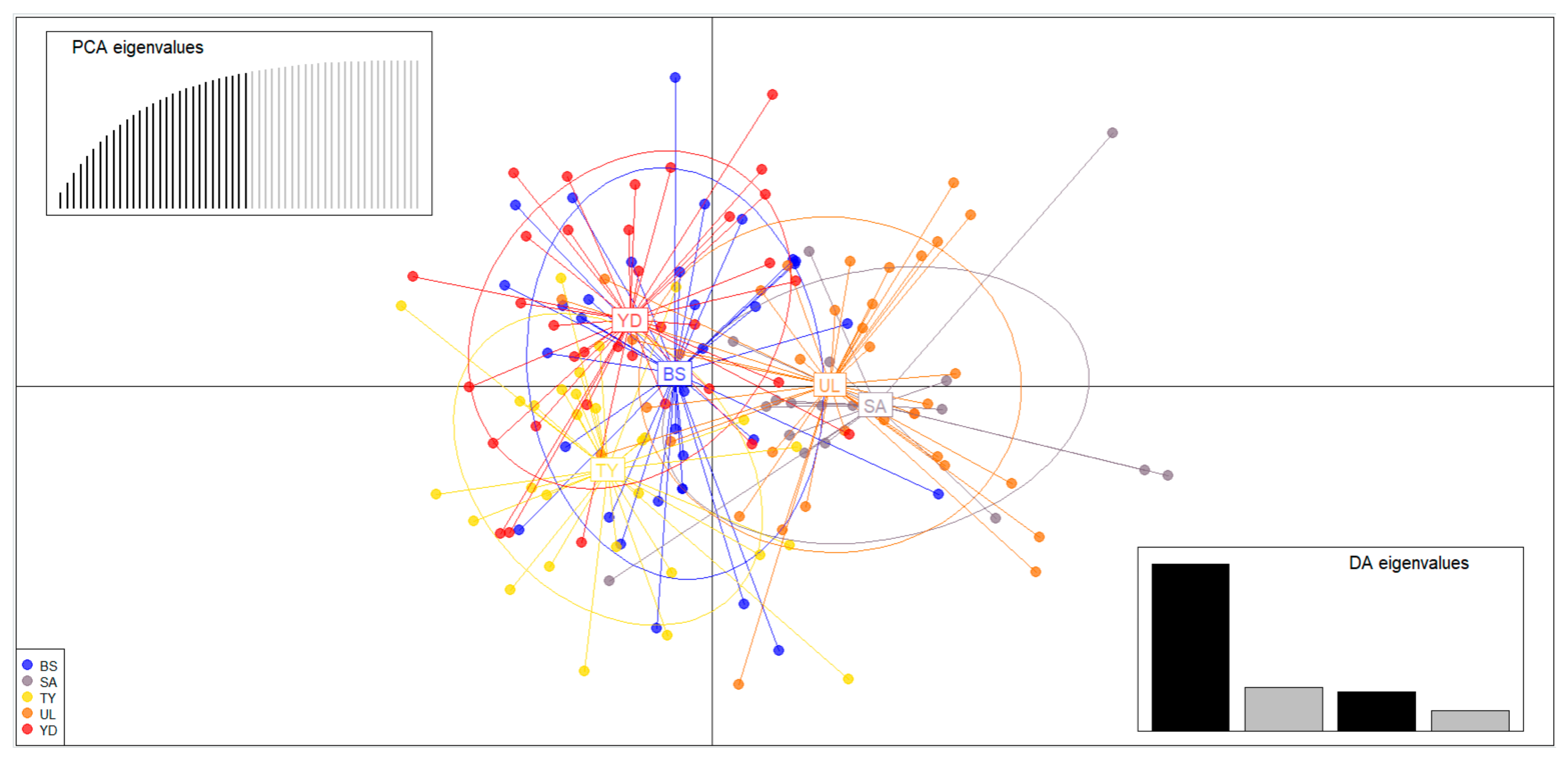 Figure 3. Scatterplots of discriminant analysis of principal components (DAPC). The abbreviated alphabets in the picture are population IDs. Colored dots of different shapes represent individuals from different geographic populations, and the PCA and DA scatterplots on the right side of the graph represent the number of principal components and discriminant functions for calculation. Colored dots represent individual samples in the scatter plot, and clusters of dots indicate a single genetic group. Population codes: BS, Busan; SA, Sinan; TY, Tongyeong; UL, Ulleungdo; YD, Yeongduk.