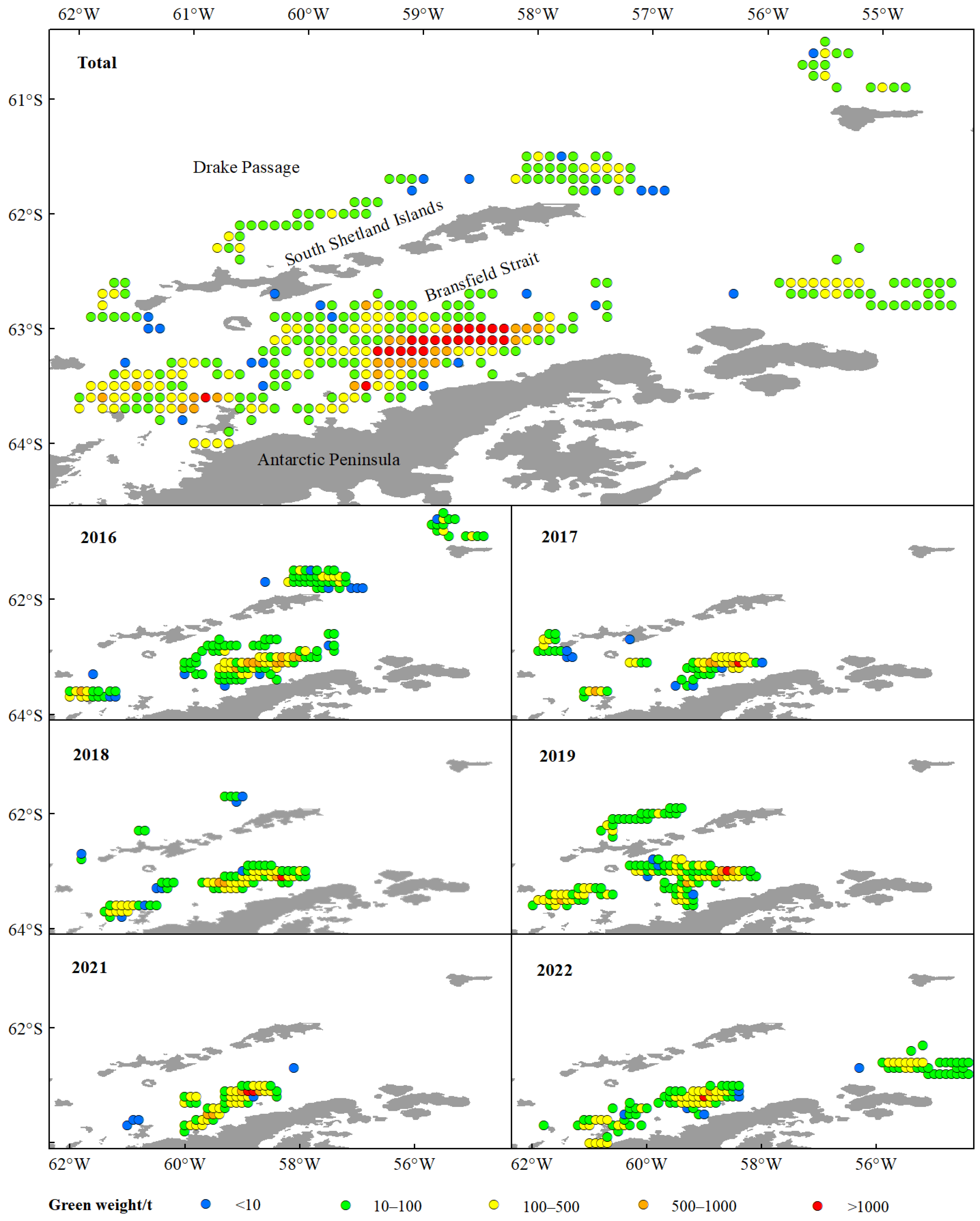 Figure 3. The spatio-temporal dynamics of green weight of commercial catches of the Antarctic krill in BS and SSI from 2016 to 2022. Note: The color codes indicate green weight ranges as follows: blue for <10 t; green for 10~100 t; yellow for 100~500 t; orange for 500~1000 t; red for >1000 t.