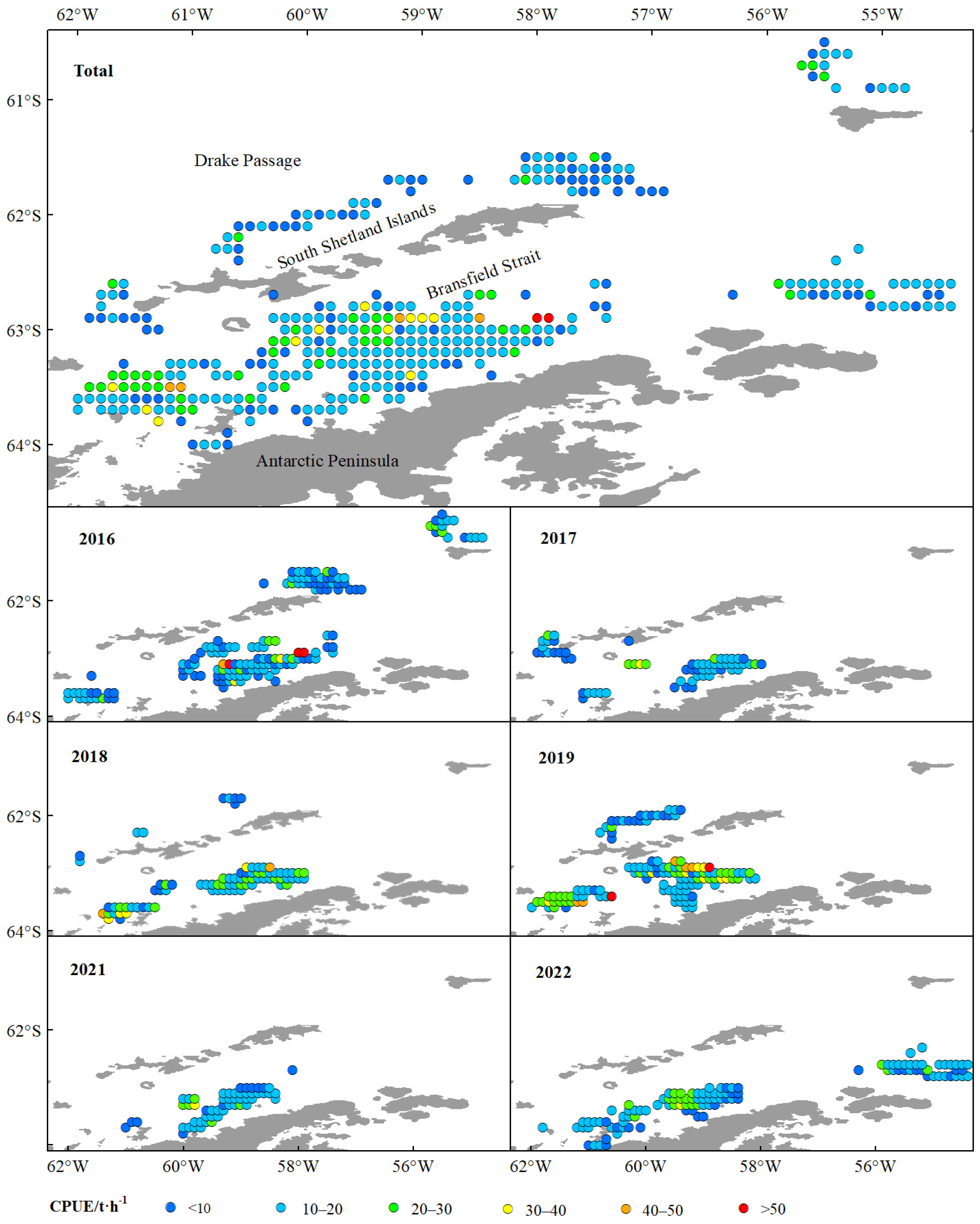 Figure 4. The spatio-temporal dynamics of CPUE of commercial catches of the Antarctic krill in BS and SSI from 2016 to 2022. Note: The color codes indicate CPUE ranges as follows: blue for <10 t·h−1; baby blue for 10~20 t·h−1; green for 20~30 t·h−1; yellow for 30~40 t·h−1; orange for 40~50 t·h−1; red for >50 t·h−1.