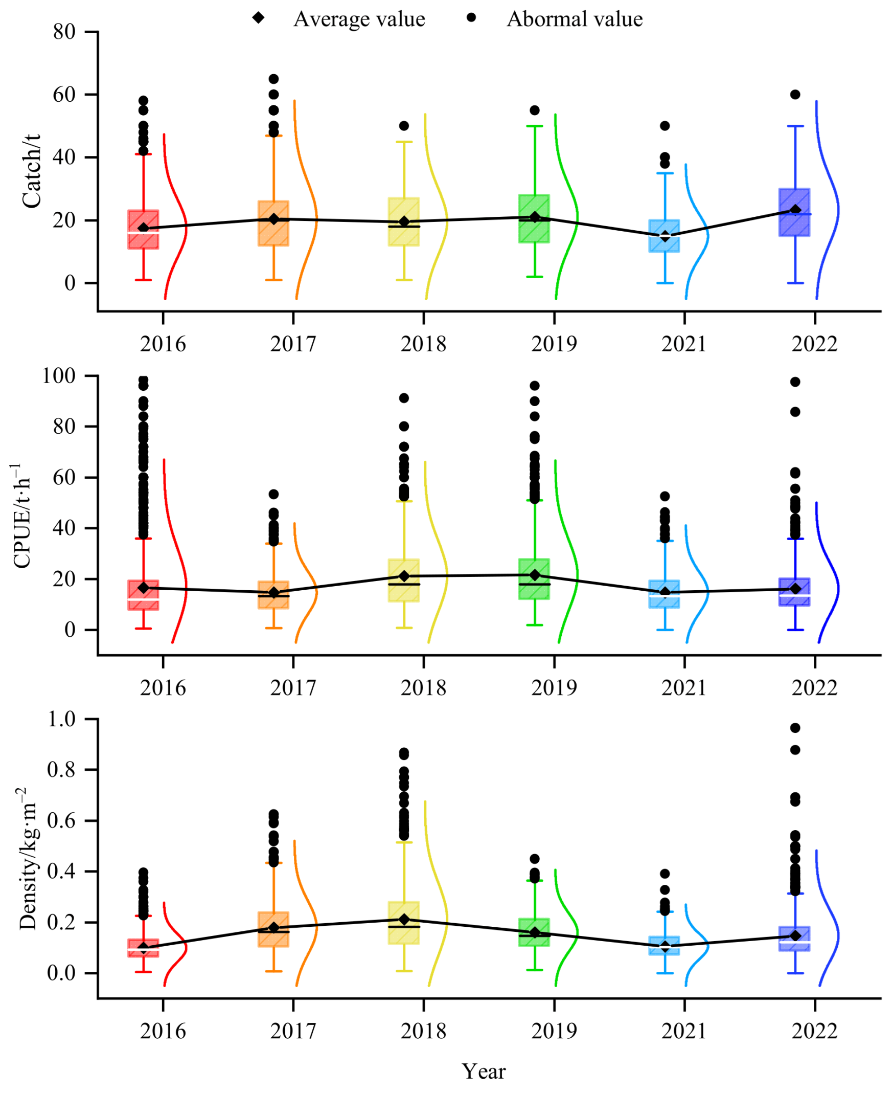 Figure 6. The distribution of the average value of catch, CPUE and density of the Antarctic krill from 2016 to 2022. Note: The upper edge and lower edge of the box in the figure indicate that 75% of the data are less than the value of the upper edge, and 25% of the data are less than the value of the lower edge, respectively. The height of the box is the difference between the third quartile (Q3) and the first quartile (Q1). The horizontal line in the middle of the box represents the median. The whiskers are the lines extending from the upper and lower edges of the box, representing the normal fluctuation range of the data, and this figure uses the Tukey method to define the range. The polyline in the figure is the average value line. The curve on the right side of the box is the normal curve for each group of data.