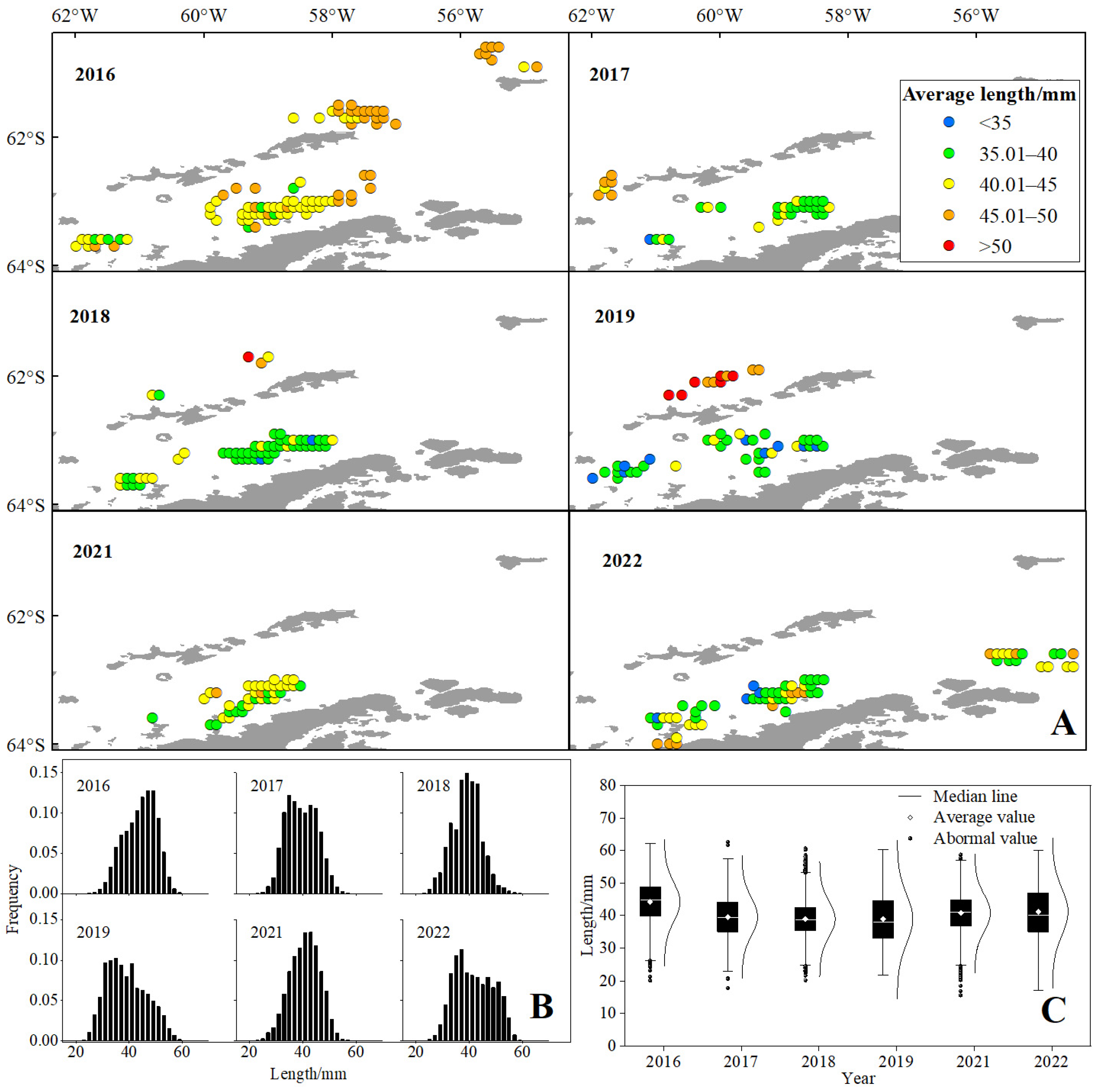 Figure 8. The spatio-temporal dynamics of average length (A), length frequency distribution (B) and distribution interval of length (C) of the Antarctic krill from 2016 to 2022. Note: The color codes indicate average length ranges as follows: blue for <35 mm; green for 35.01~40 mm; yellow for 40.01~45 mm; orange for 45.01~50 mm; red for >50 mm.