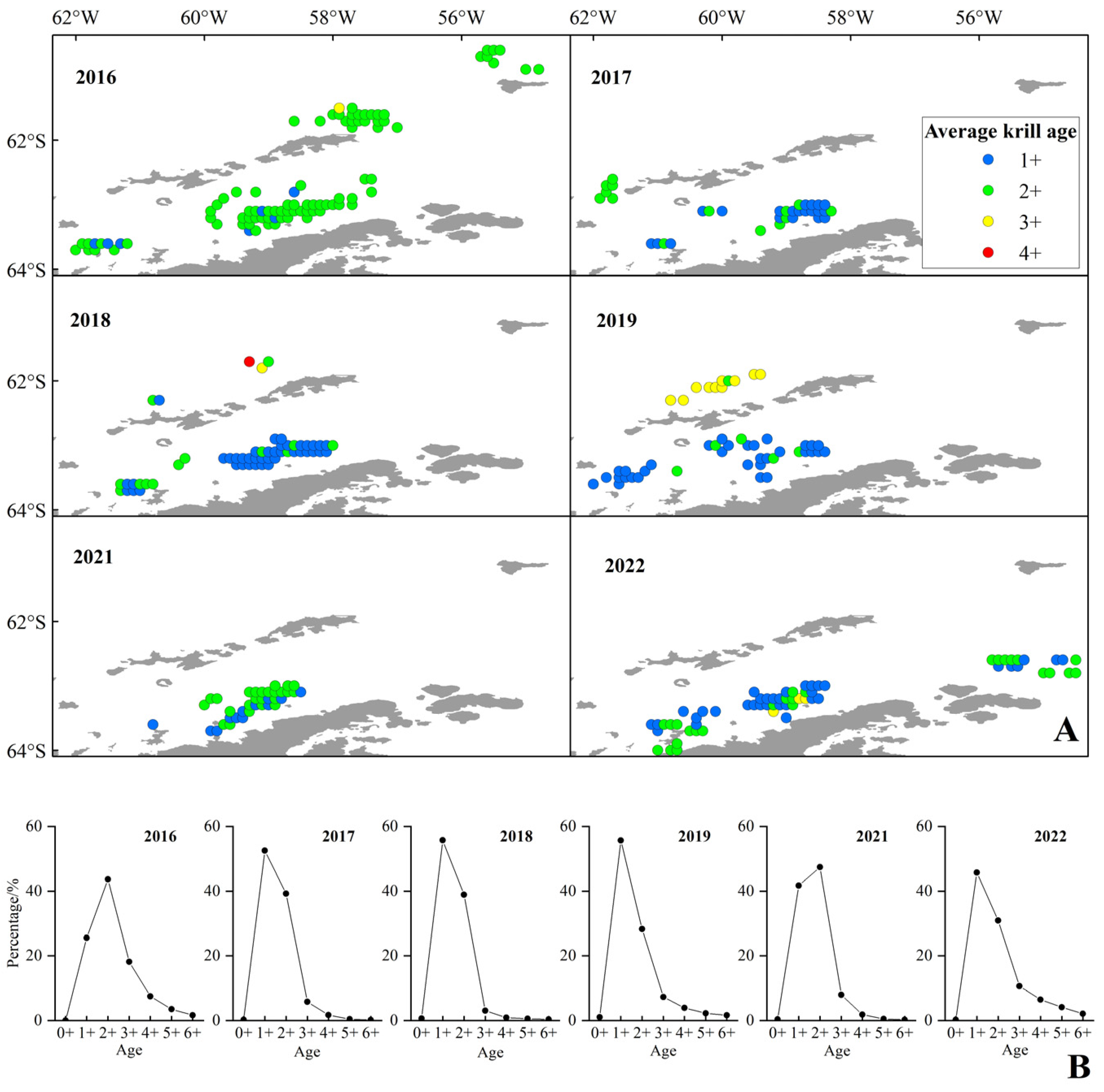 Figure 9. The distribution of age (A) and age frequency (B) of the Antarctic krill from 2016 to 2022. Note: The color codes indicate average krill age ranges as follows: blue for 1+; green for 2+; yellow for 3+; red for 4+.