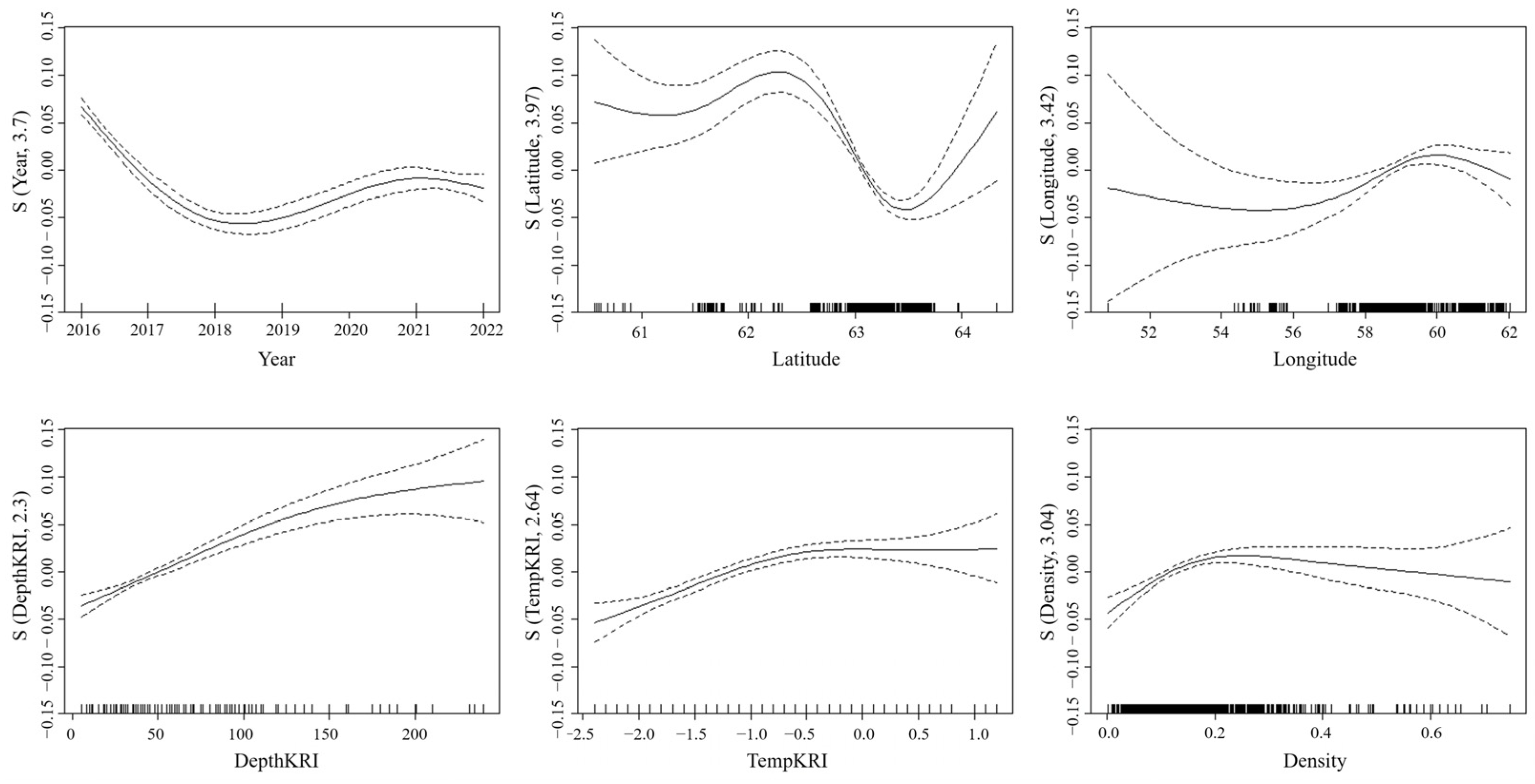 log(Length)~s(Year) + s(Latitude) + s(Longitude) + s(DepKRI) + s(TempKRI) + s(Density)0.535−2018.36954.6