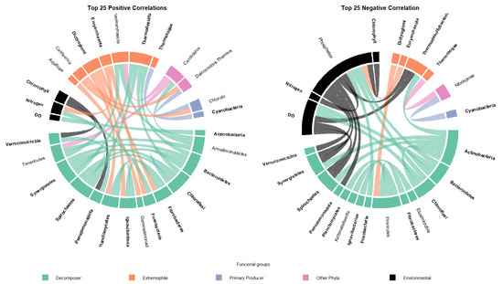 A Spearman correlation analysis was performed to examine relationships between bacterial functional groups and environmental variables, retaining only statistically significant correlations (p < 0.05). From this subset, the 25 strongest positive and negative correlations were selected to visualize the dominant interaction patterns. The resulting network is shown in Figure 3.