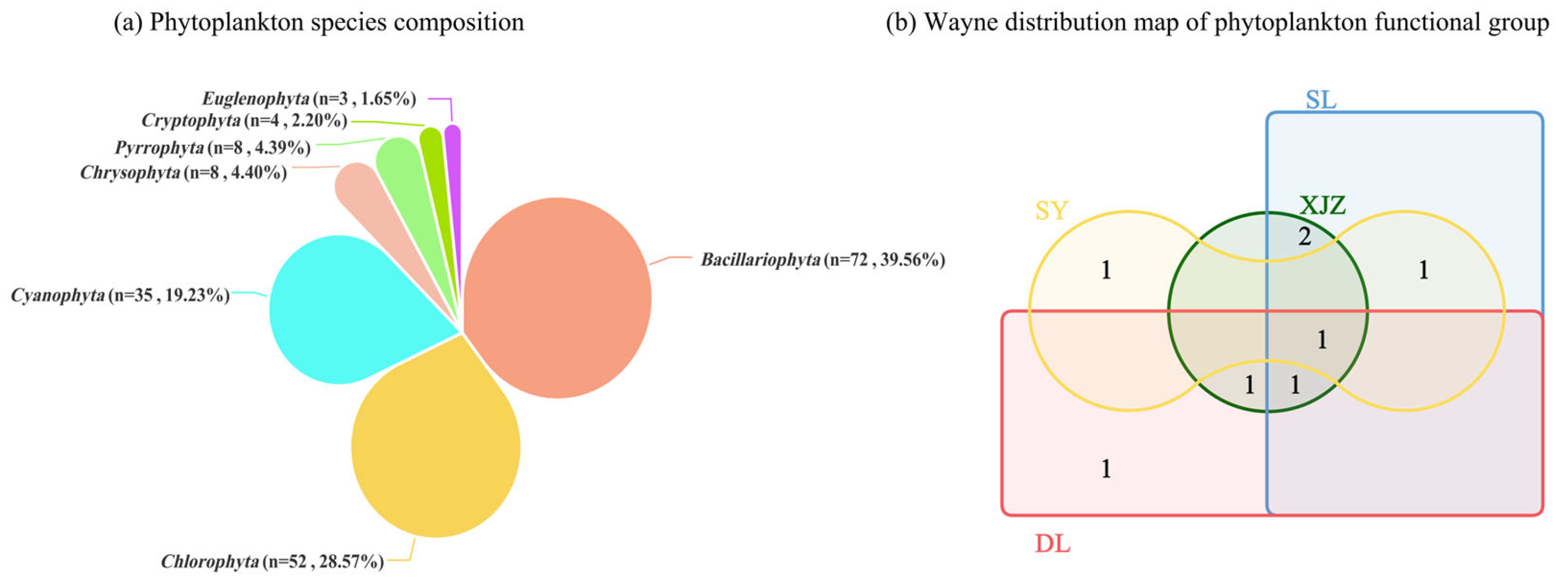 - Zhang, H.; Peng, Y.Y.; Zou, X.X. Characteristics of phytoplankton functional groups and their relationships with environmental factors during extreme drought in Xinfengjiang Reservoir, Guangdong Province. J. Lake Sci. 2024, 36, 416–429. [Google Scholar] [CrossRef]