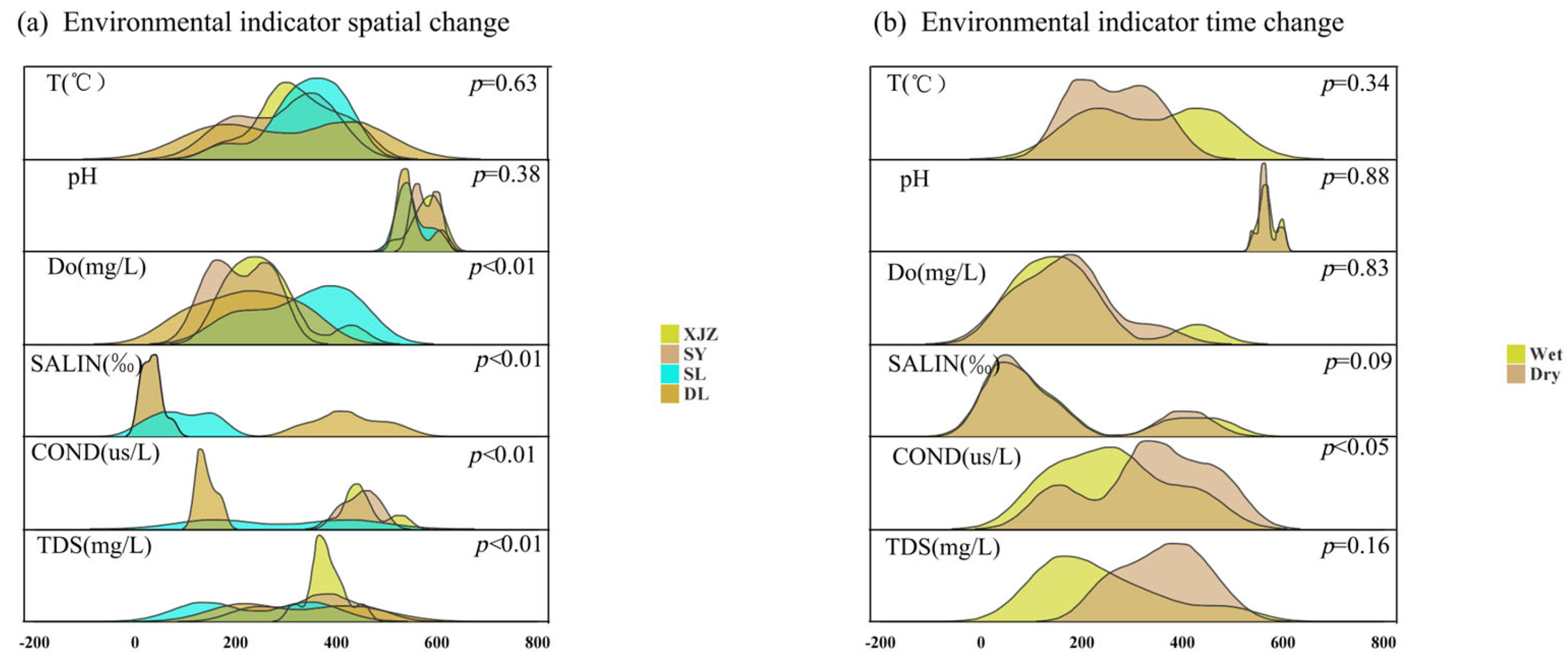 3.2. Analysis of Spatiotemporal Dynamics of Water-Body Environmental Factors
