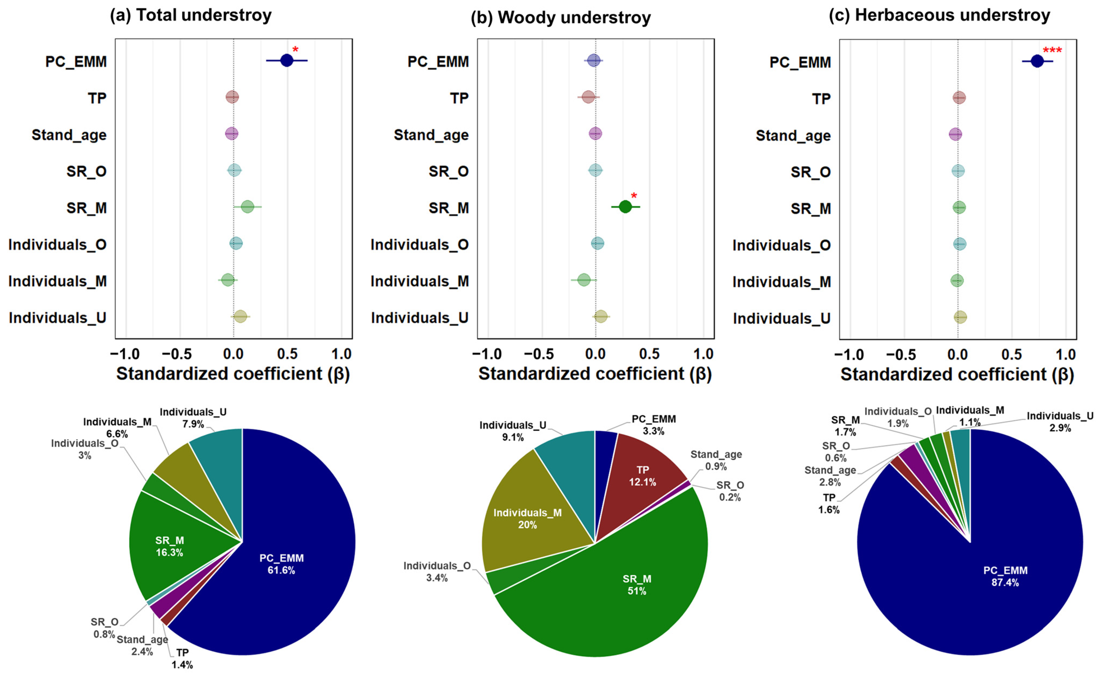 - Chun, J.H.; Ali, A.; Lee, C.B. Topography and forest diversity facets regulate overstory and understory aboveground biomass in a temperate forest of South Korea. Sci. Total Environ. 2020, 744, 140783. [Google Scholar] [CrossRef]