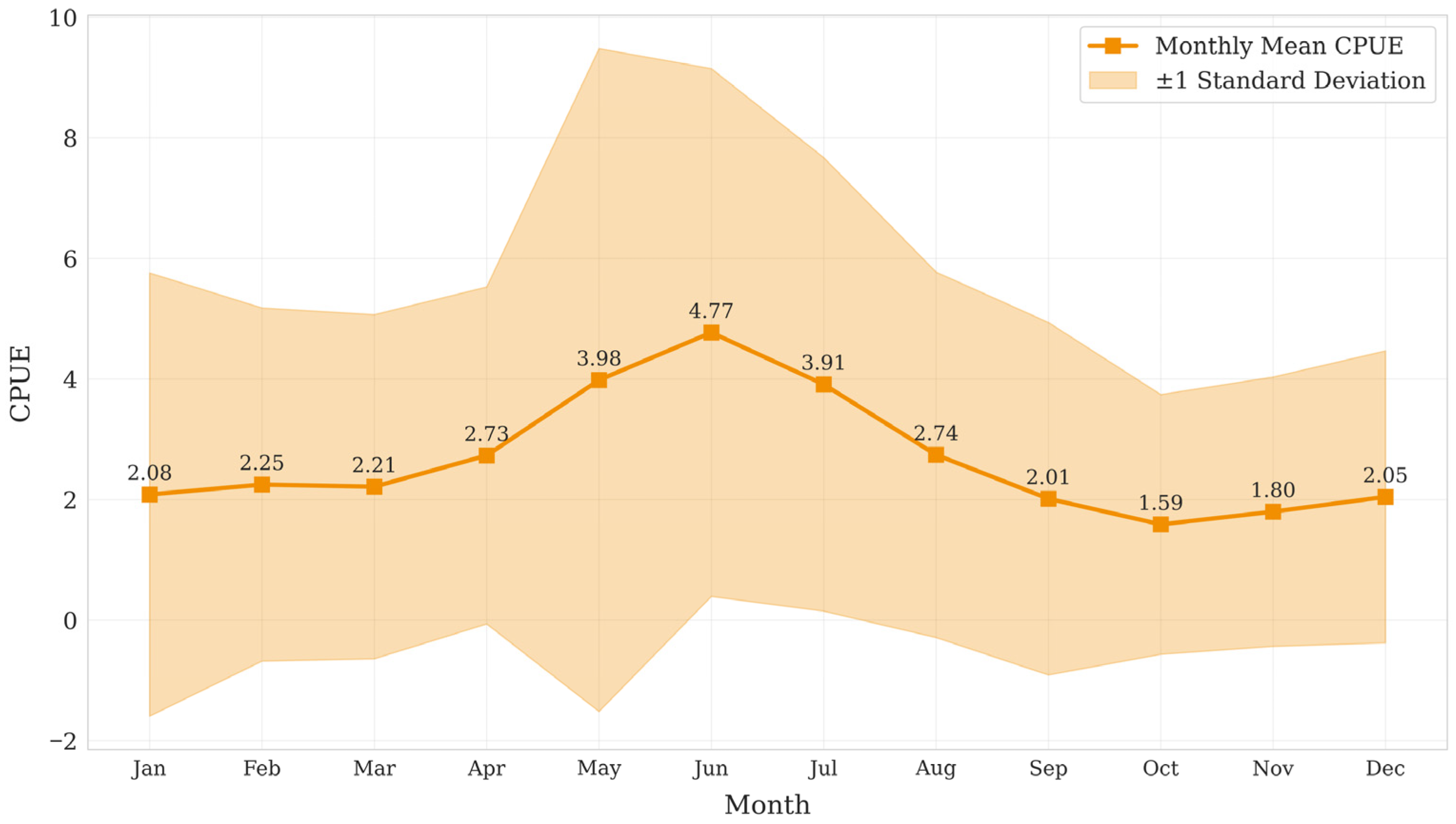 The temporal dynamics of Catch Per Unit Effort (CPUE), plotted as monthly means with standard deviation ranges, revealed significant seasonal fluctuations (Figure 2). Specifically, CPUE values showed pronounced variability from May to August alongside rising temperatures, peaking in June and demonstrating a trend of higher CPUE during the warm spring and summer months.