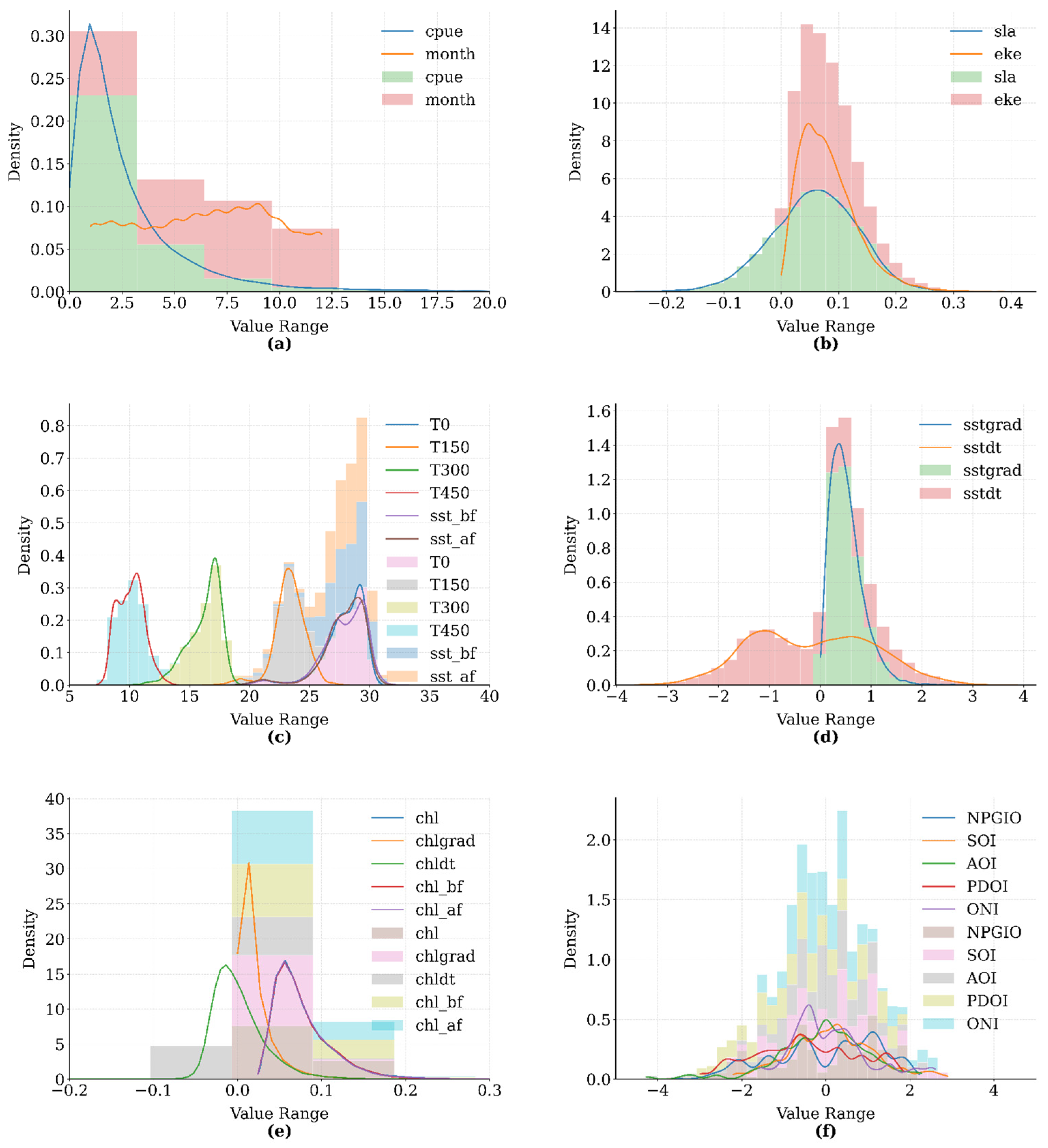 These features were categorized based on their environmental relevance to temperature, chlorophyll concentration, and oceanographic phenomena. As illustrated in Figure 3, the variables were grouped into six thematic categories: fishery indicators, ocean dynamics, thermal structure, temperature gradients, chlorophyll-related variables, and climate indices. Each subplot integrates kernel density estimation (KDE) curves with semi-transparent histograms, thereby simultaneously presenting the smoothed distribution trend and the frequency of the raw data.