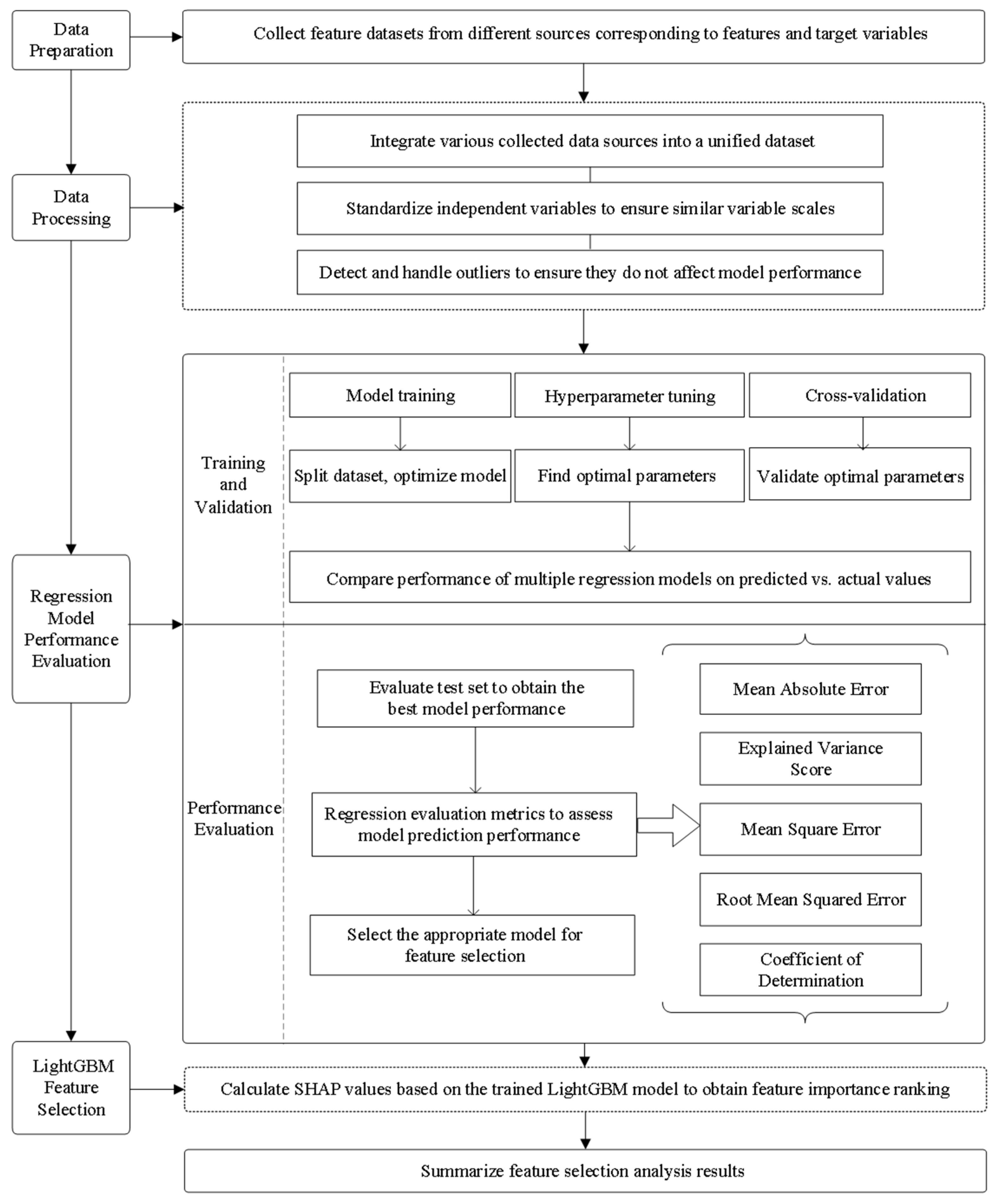 To further optimize model performance, cross-validation was employed to tune hyperparameters such as regularization strength. The selection of the optimal model was based on the quantitative comparison of multiple error evaluation metrics, including mean squared error (MSE) and the coefficient of determination (R2). The workflow of the modeling process is illustrated in Figure 4.